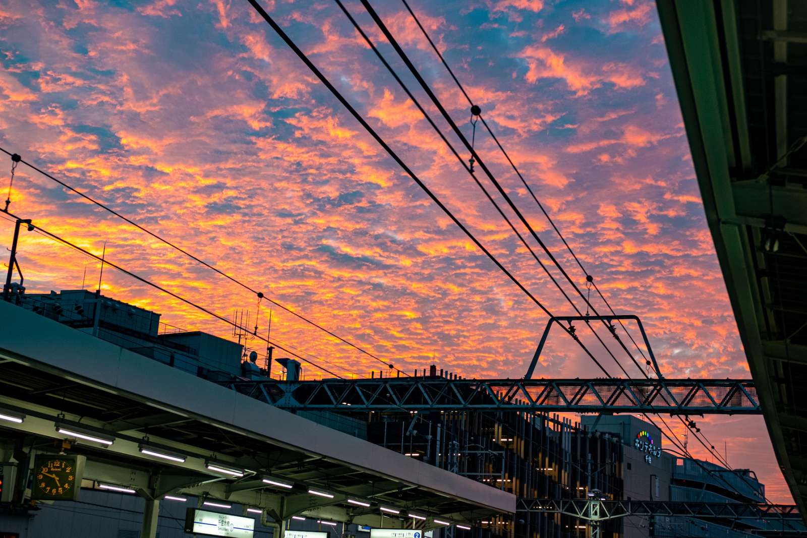 移動の間、日が暮れていく空。右手の少し先にはスカイツリーが見えて、天辺が一番星のように白く光っています。左手の空はブルーとグレーとオレンジの色が雲に混ざっている。