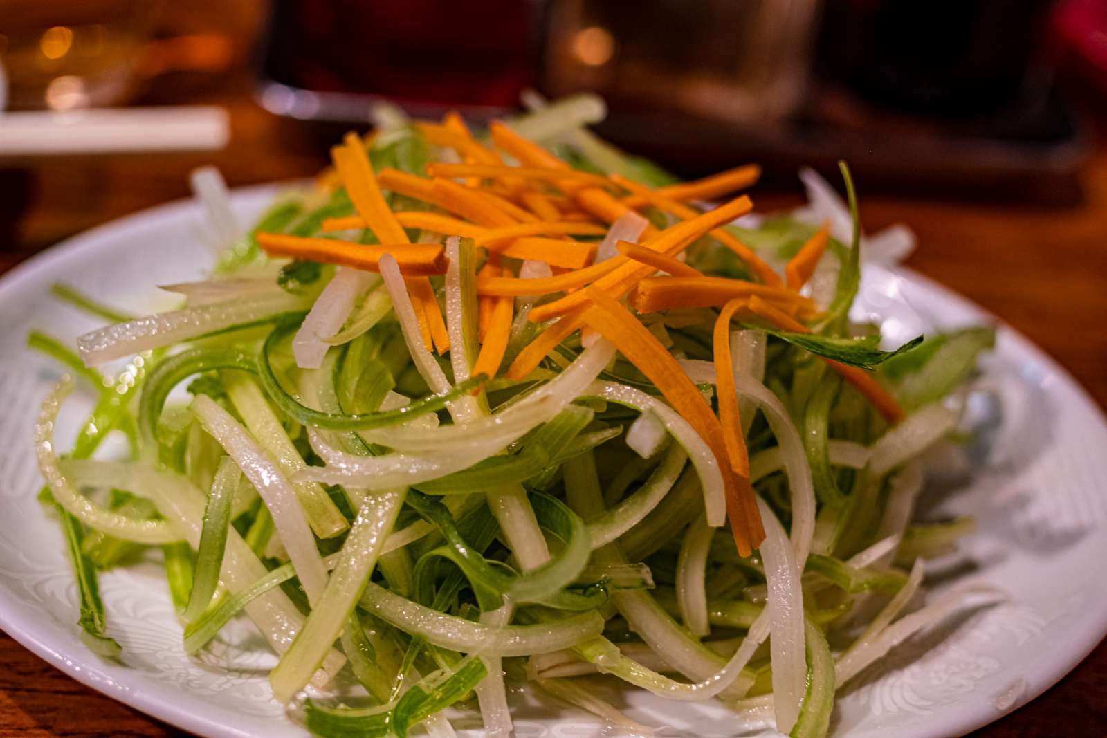 「おまちどうさま。」真っ白なオーバルのお皿に山盛りに盛られたセロリが出てきました。シャッキシャキのセロリとニンジンの千切り。セロリ2本分くらいありそうな量。味付けはちょっと薄味だったので、お醤油とお酢とラー油を少し垂らして和えてからバリバリ食べる。これだけで、ビールが進む。