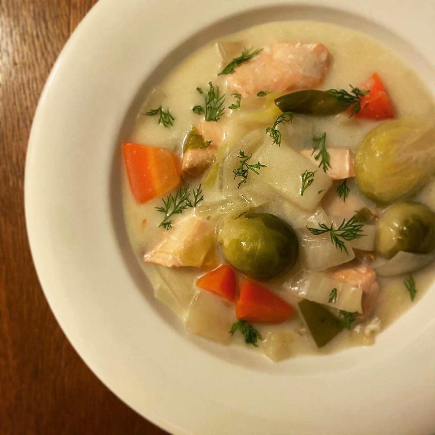 鮭のホワイトシチュー、春菊と白菜とりんごのサラダ、トマト、しらすと九条葱のオムレツ、パン