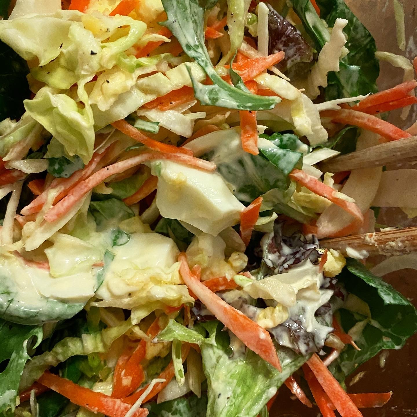 コールスローにはゆで卵を入れてボリュームアップ。明日の朝はツナを加えて、パンに挟む予定。