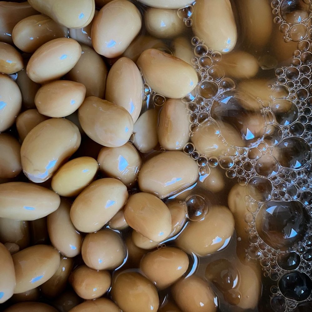大豆をたっぷりの水に一晩漬けて、柔らかくなるまでゆっくりゆっくり茹でる。