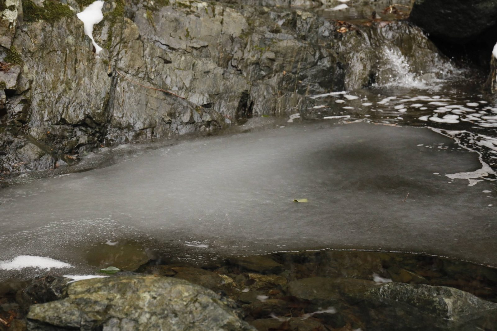 おっ、滝つぼが凍りかけ。乗れまいかと踏んでみるものの、すぐに割れそう。落ちたくないから断念、残念です。その様子を見ていた愛犬も乗ってみたところ、