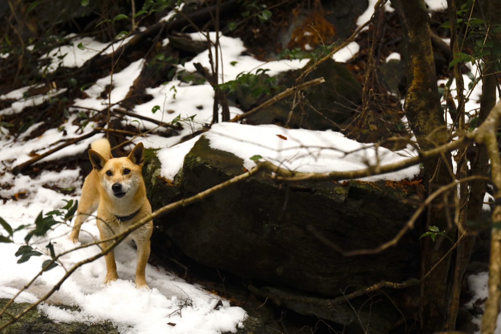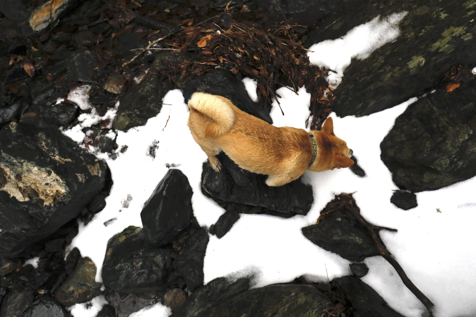 愛犬も同行。気温がそれほど低くないからか、寒そうなそぶりも見せません。このあと犬も歩けば、、、な出来事に遭遇します。