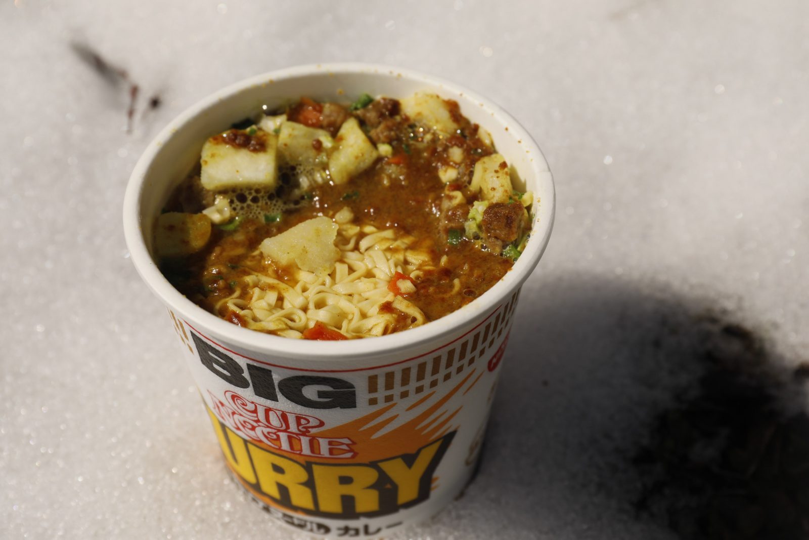 駐車場の片隅でお湯を沸かし、BIGに注いで待つこと3分。ふたを開ければ待望のカレーヌードルです。