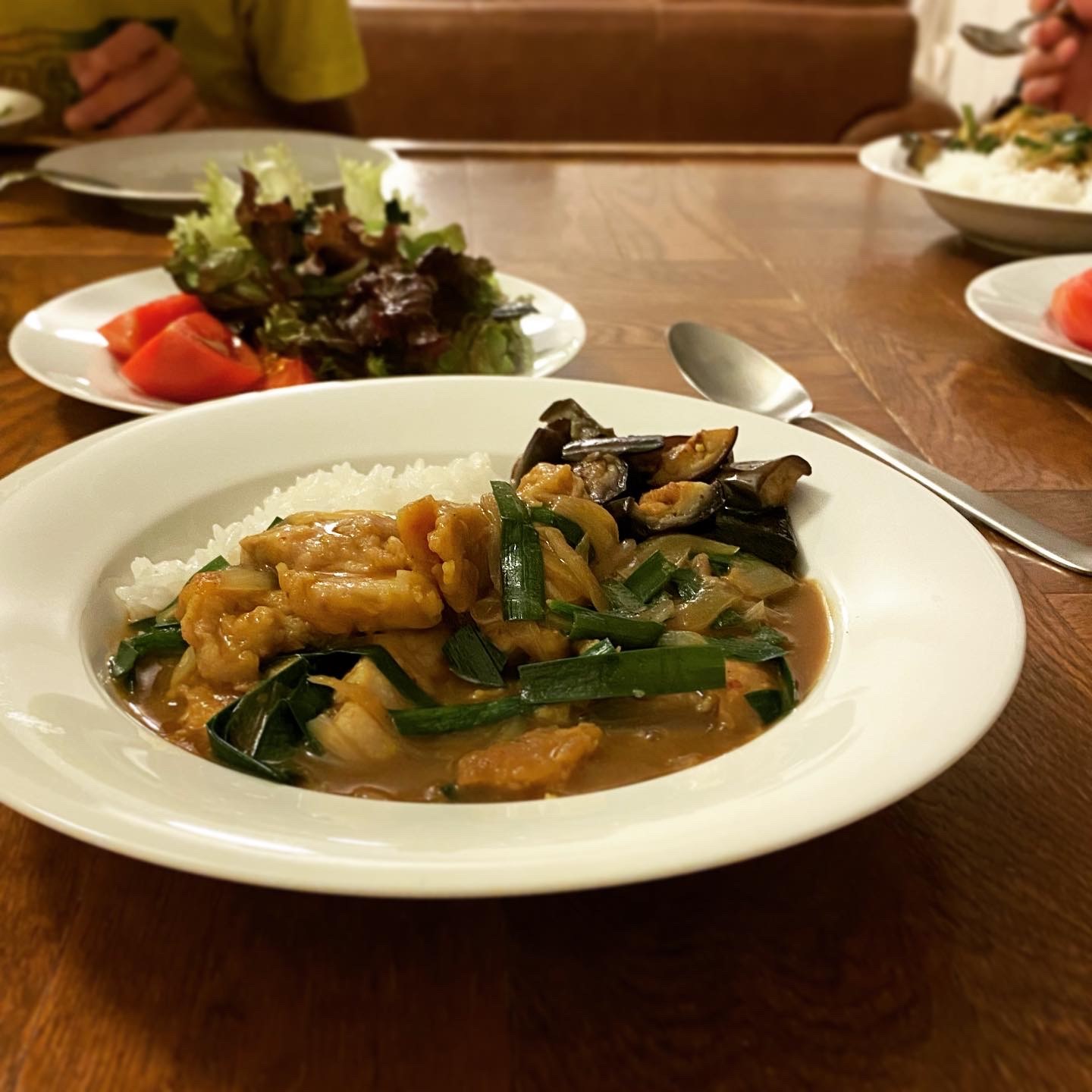 ニラ入りポークジンジャーカレー、レタスとトマトのサラダ