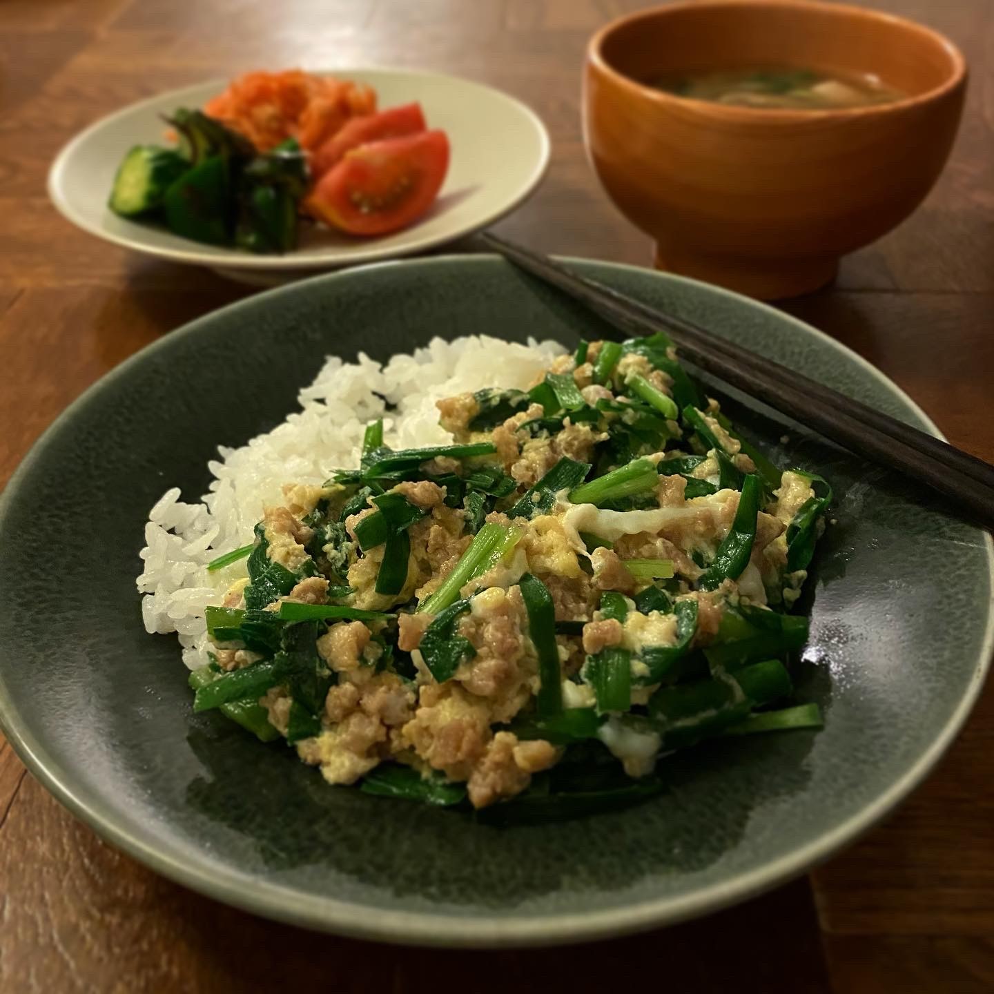 ニラ玉そぼろ丼、胡瓜の塩昆布和え、トマト、豚汁