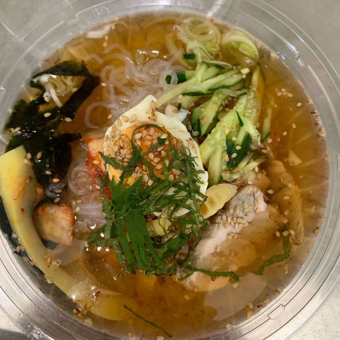 韓国冷麺の麺を「しらたき」で代用したもの。これ、おいしい。