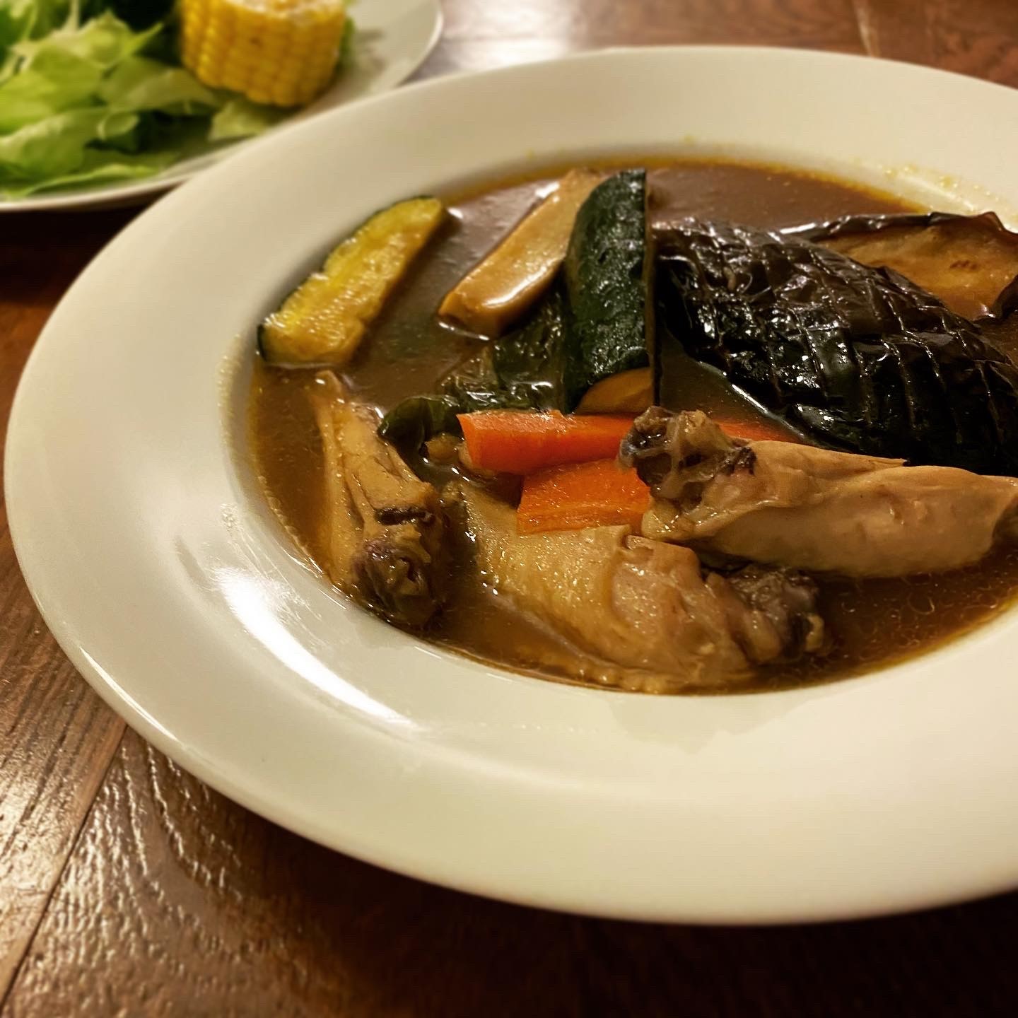 スープカレー(鶏手羽中、人参、茄子、ピーマン、ズッキーニ)、レタスとブロッコリーとコーンとトマトのサラダ