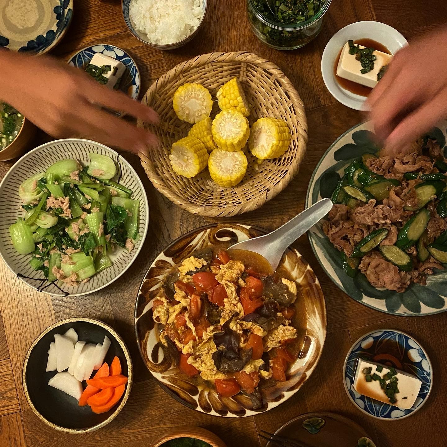 豚と胡瓜の炒め物、トマトと卵と木耳の炒め物、青梗菜のツナ和え、コーン、冷奴(ニラ醬油)、みそ汁(昨日の)、ぬか漬け、白ごはん