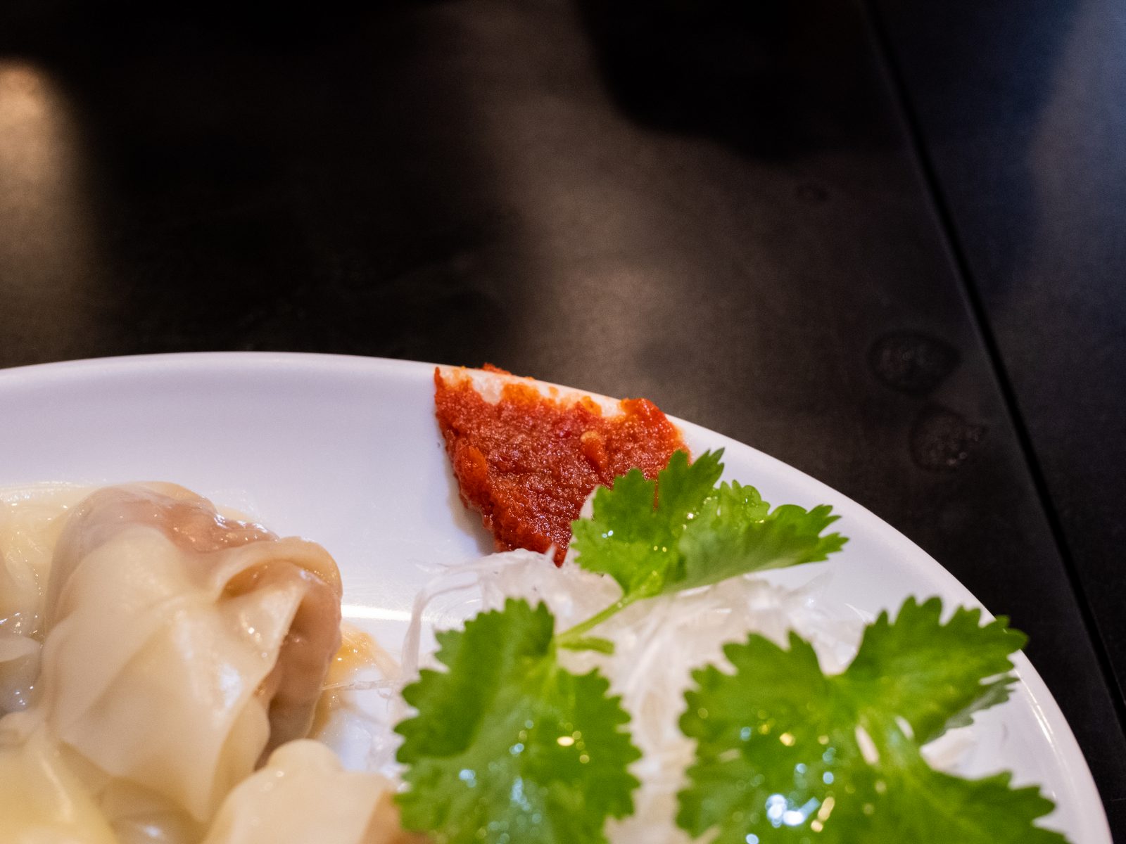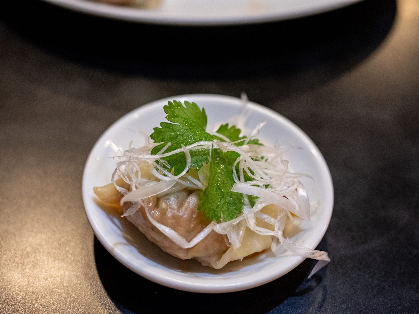 たっぷりの白髪葱の上には、水気を含んだおいしそうなパクチーの葉っぱが二つ。ほんのり黄色のわんたんの皮は艶々に光っている。シャッターを1枚切る間、もう待てなかった山田が、小皿に酢・醤油・ラー油を注いでわんたんを頬張っている。