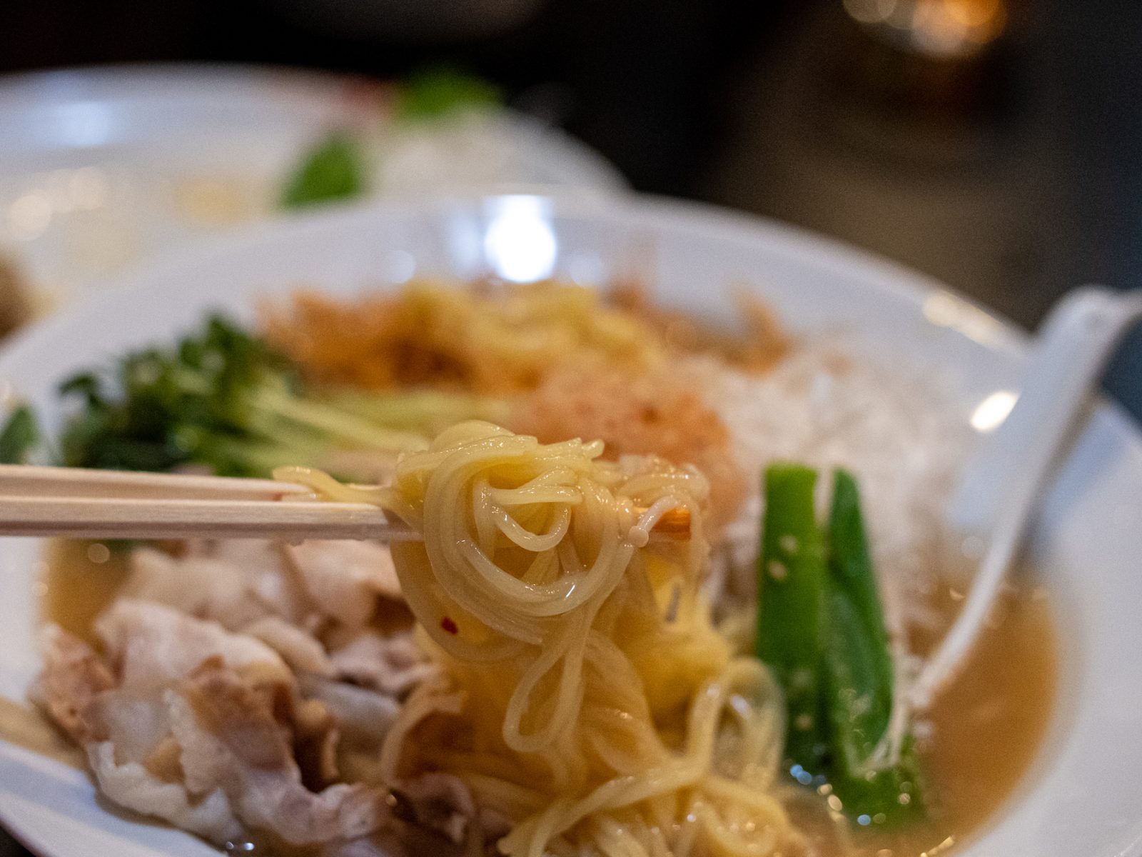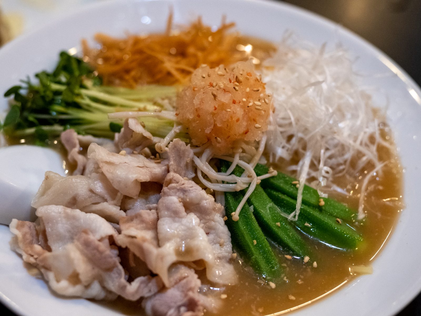 歯応えのしっかりしたツルツルの細麺。揚げわんたん、豚しゃぶ、オクラ、カイワレ大根に白髪葱。中央にはもみじおろしがのっていて、どの具材と麺を一緒に食べようか悩むのも楽しい。