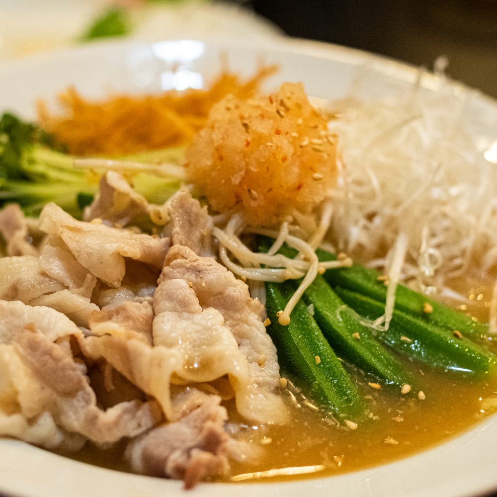 歯応えのしっかりしたツルツルの細麺。揚げわんたん、豚しゃぶ、オクラ、カイワレ大根に白髪葱。中央にはもみじおろしがのっていて、どの具材と麺を一緒に食べようか悩むのも楽しい。