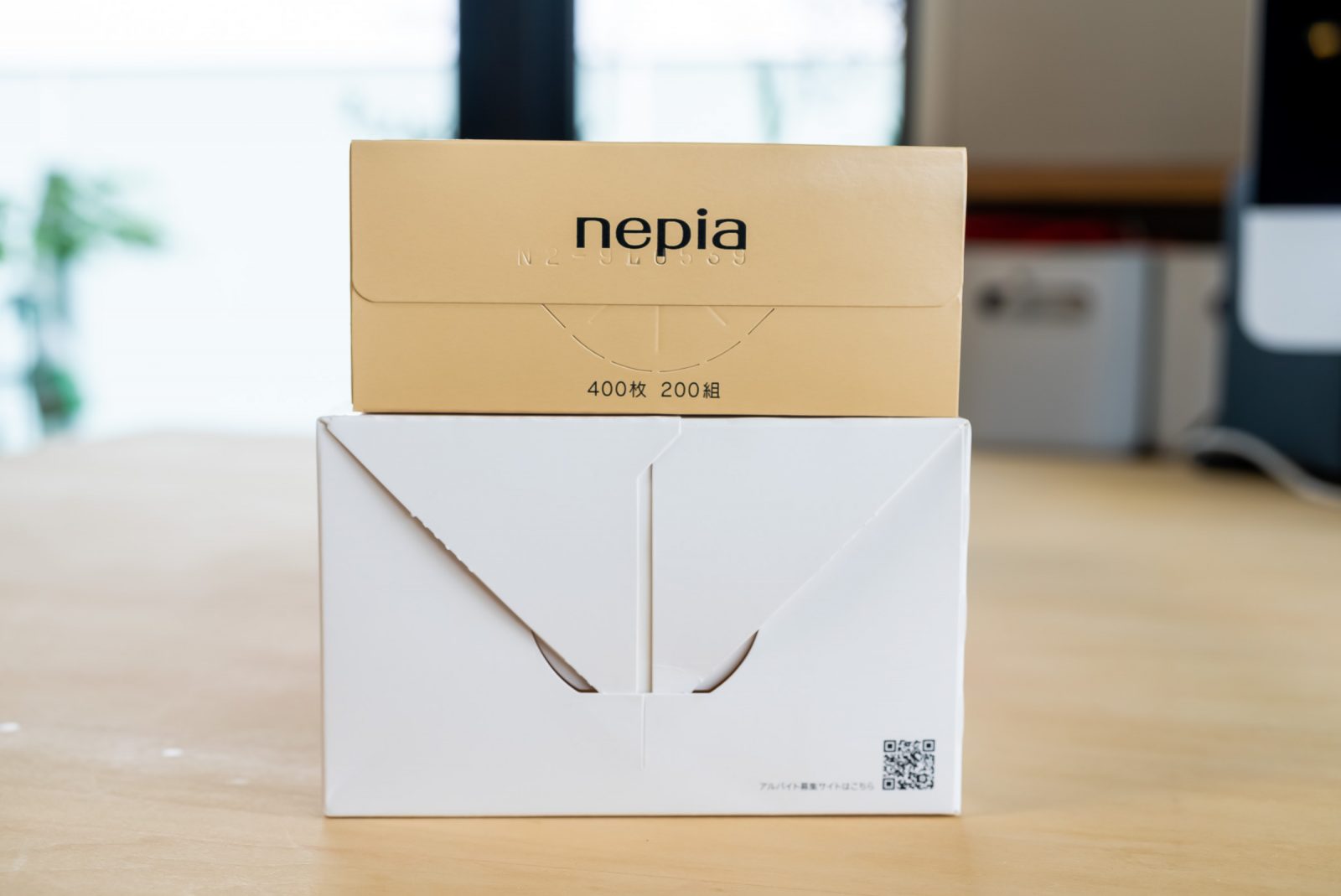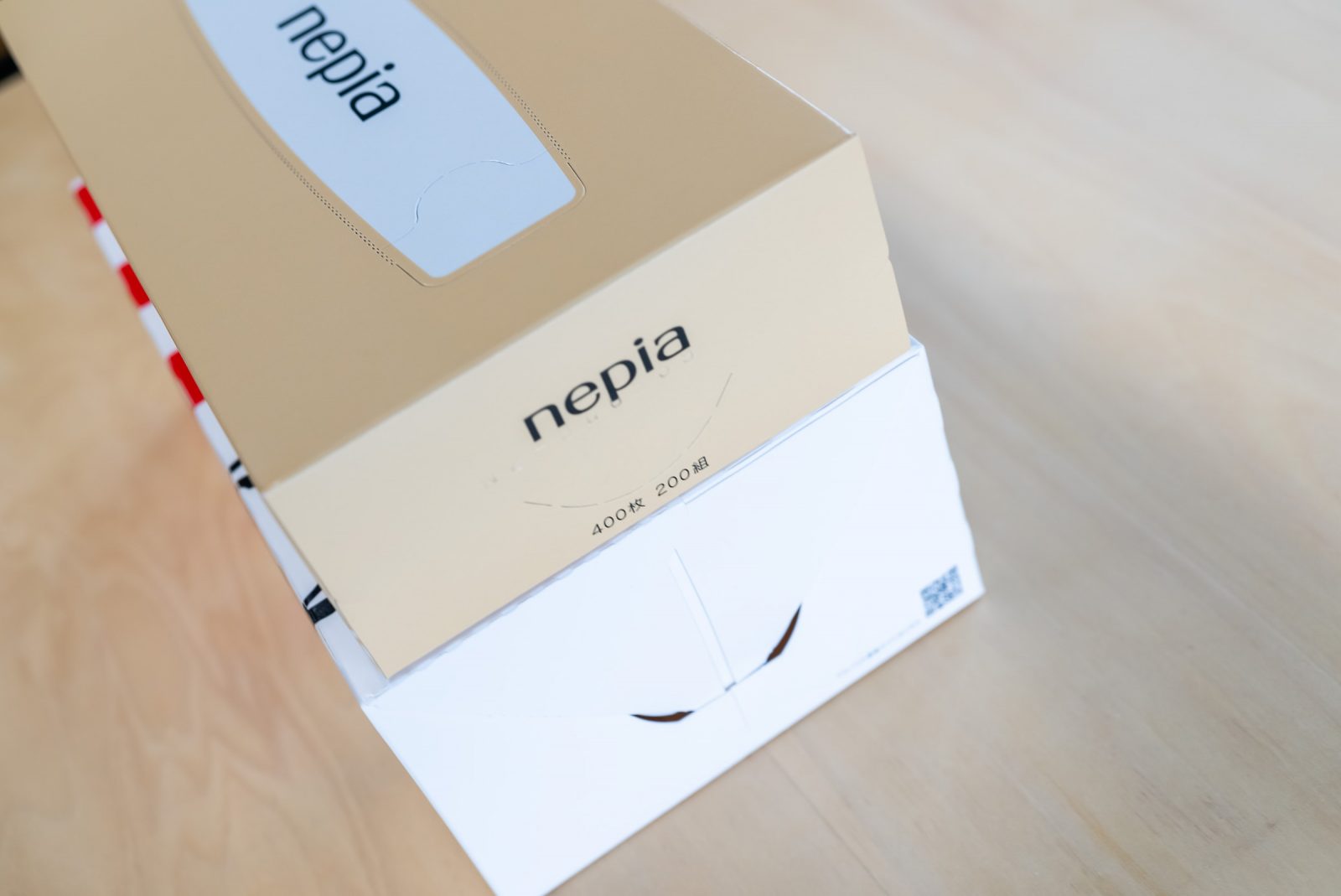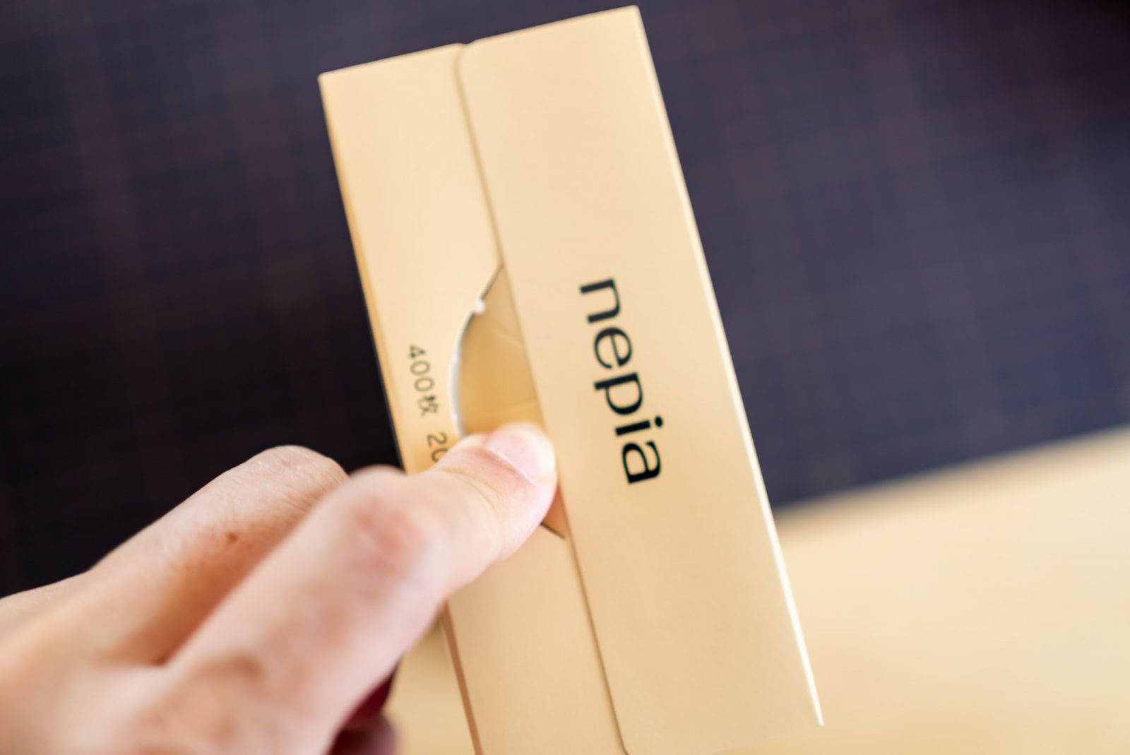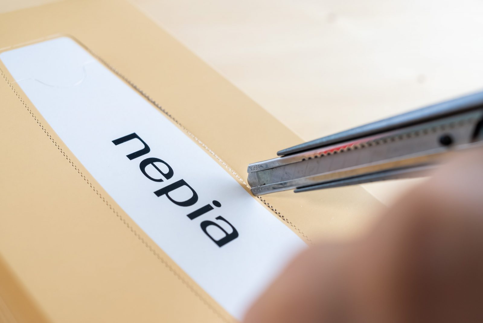 今回のティッシュはせっかくなので、ネピア先輩インスパイアです。「さしゅっ!」とペーパーをとる口をネピアの形で作っていきましょう。ネピアの口の形をインスパイヤさせていただくので、口だけくり抜きます。指いれてずぼっととるとせっかくの形がだいなしになるので、カッターのはを出さずにぎざぎざのところを押して抜いていきます。
