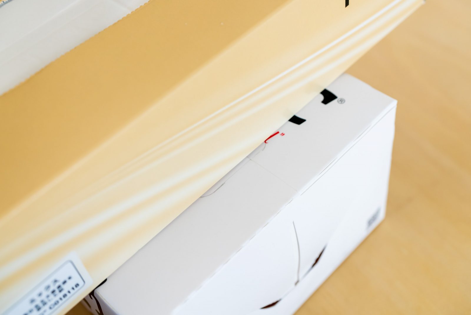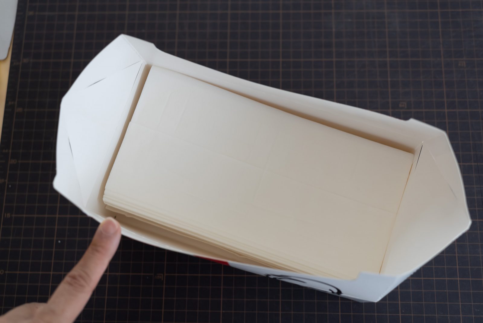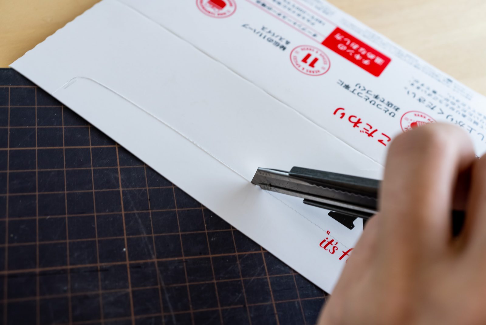はい切っていきます。この時、片方ずつ切らないといけないんですが、ハサミだとちょっと難しい。だったらカッターだ。箱を畳んで、間にカッターマット挟めば、片面づつきれますね。角を使おう。