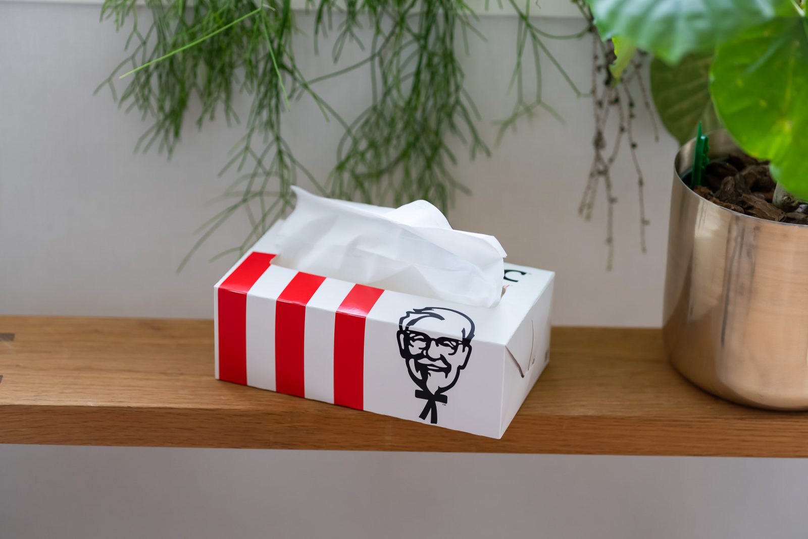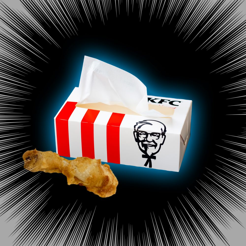 とはいえね。みなさん分かってると思うんですが、ケンタッキーたんべるときって必要なのはウェットティッシュなんですよ。このままティッシュ使うとオイリーフィンガーにティッシュがくっつきます。あくまでこれはインスパイア、幻です。お子さんの夏休みの工作なんかにいかがですか?数日間は香ばしい揚げ物のスメルも楽しめますよ。
