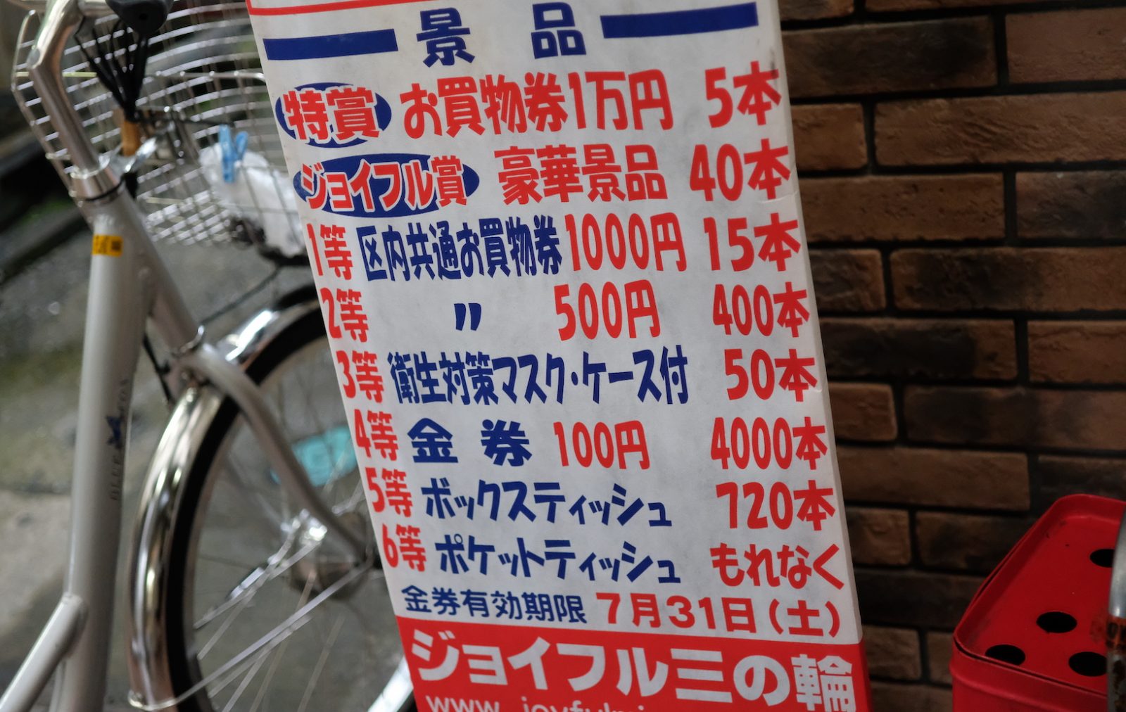 お店に戻る途中、景品の内容が書かれた立て看板を見つけました。我ら、4等。3等のマスクより、商店街のお買い物券。なんか嬉しいよね。すごくよかったんじゃない?
