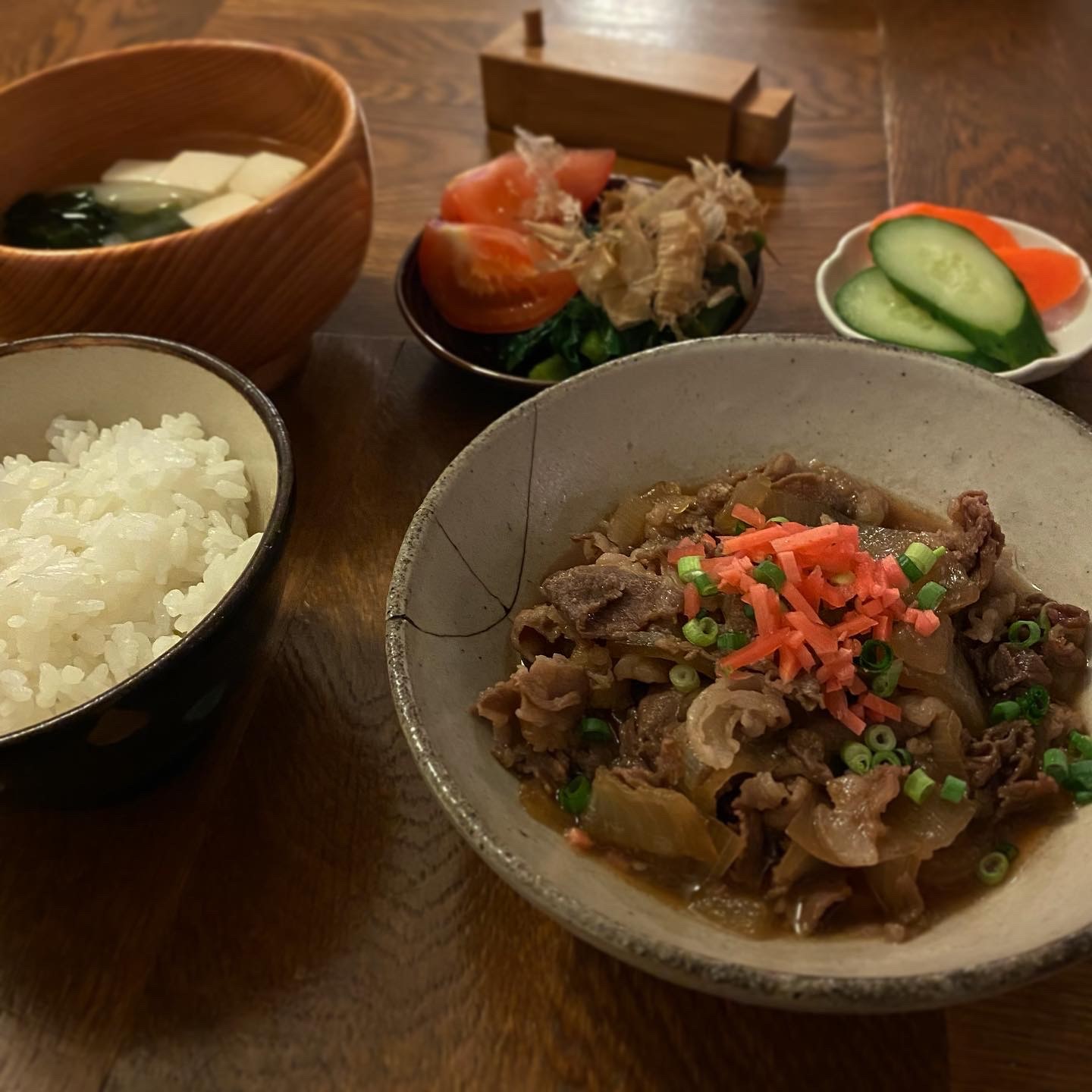 牛丼、つるむらさきのお浸し(梅醤油)、トマト、ぬか漬け、みそ汁(長葱、ワカメ、豆腐)