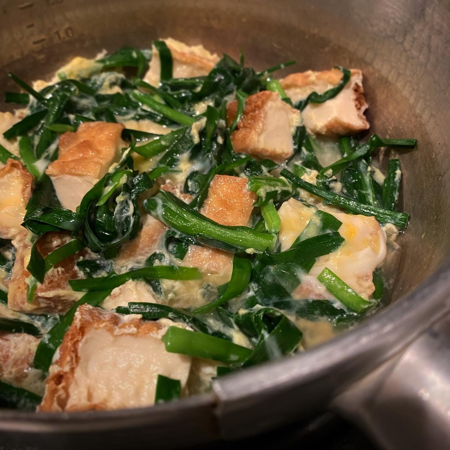冷しゃぶ(茹でキャベツ、トマト)、にらと厚揚げの卵とじ、ぬか漬け、白ごはん