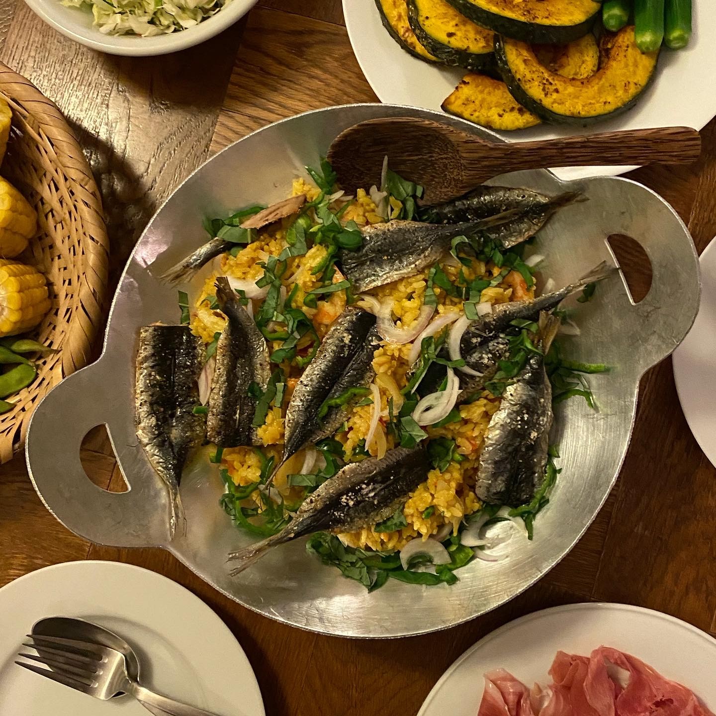 鰯と海老のビリヤニ風混ぜごはん、生ハム、枝豆、茹でもろこし、茹でオクラ、南瓜のオーブン焼き、キャベツと青じその塩もみサラダ