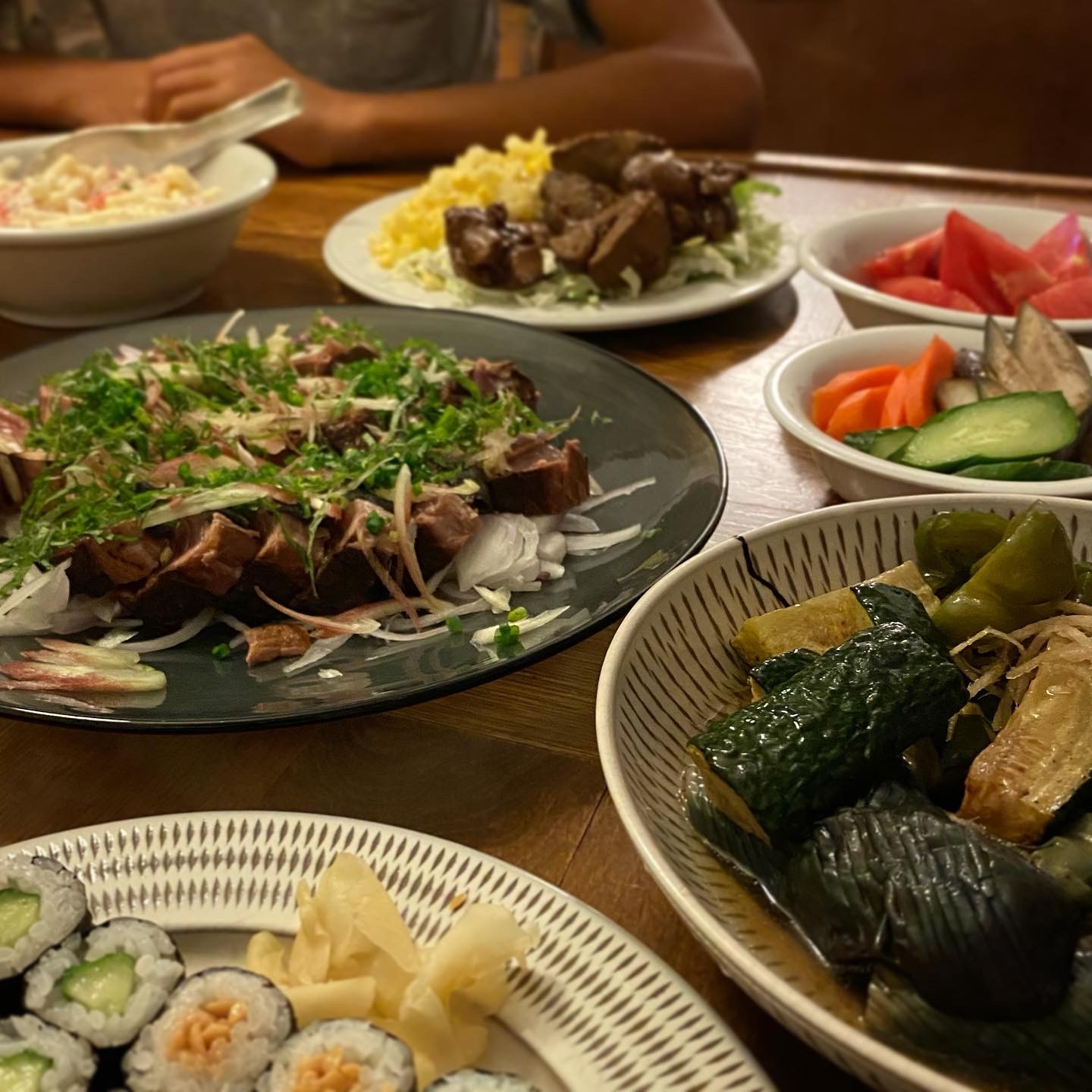 鰹のたたき、揚げ浸し(昨日の)、じゃがもろこし(昨日の)、鶏レバーのワイン煮(買ってきた)+千切りキャベツ、マカロニサラダ(買ってきた)、トマト、ぬか漬け、細巻き(買ってきた)