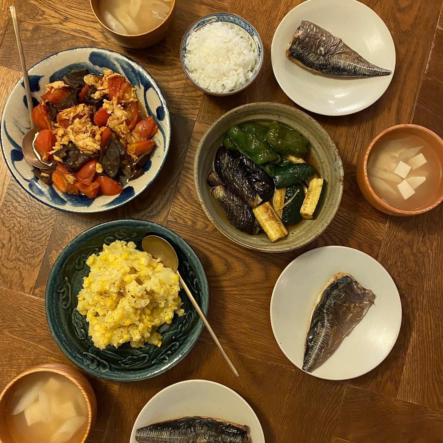 鯵の干物、じゃがもろこし、トマトと卵と木耳の炒め物、揚げ浸し(茄子、ズッキーニ、ピーマン)、ぬか漬け、みそ汁(昨日の)、白ごはん