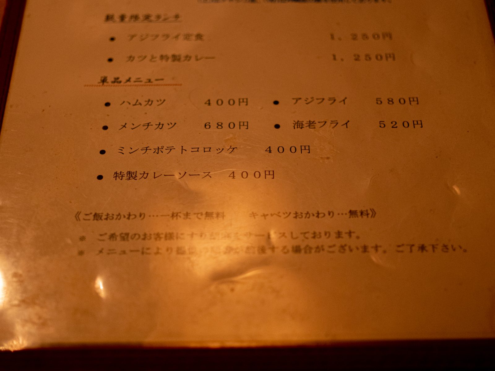 単品メニューに並ぶ「特製カレーソース」の文字。こ、これは!まずロースの豚かつを頼んで、カレーソースをトッピングという選択もあったのでは!忙しそうな店内。今から注文を変えるのは申し訳ない。心は決まっていたじゃないか。今日はカツカレーを楽しむべし。また次回、豚かつとカレーソースの組み合わせを。必ずや。