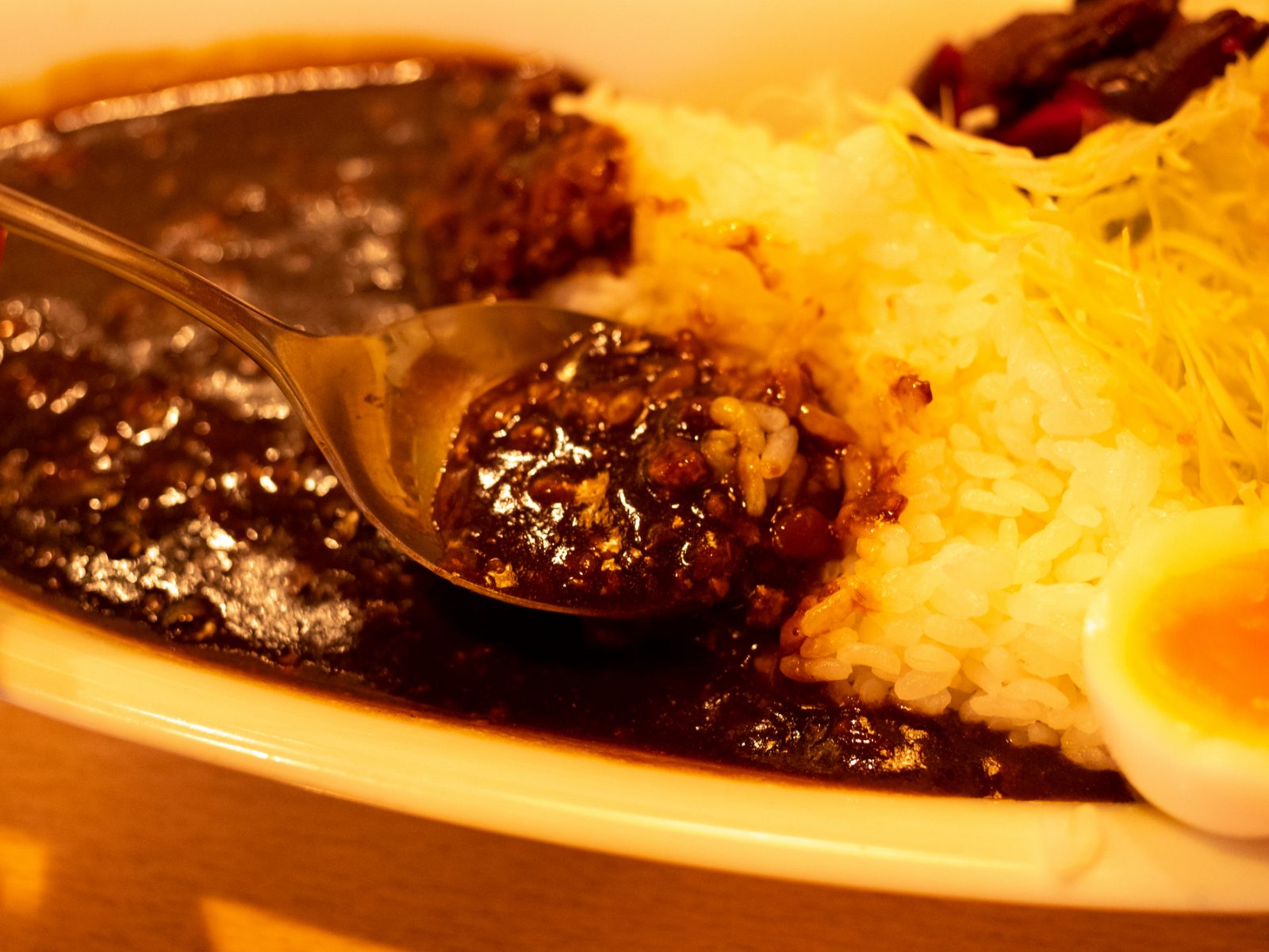 そしていよいよ、カレーをいただきます。黒いカレーの中に、豚のひき肉がしっかり存在しています。