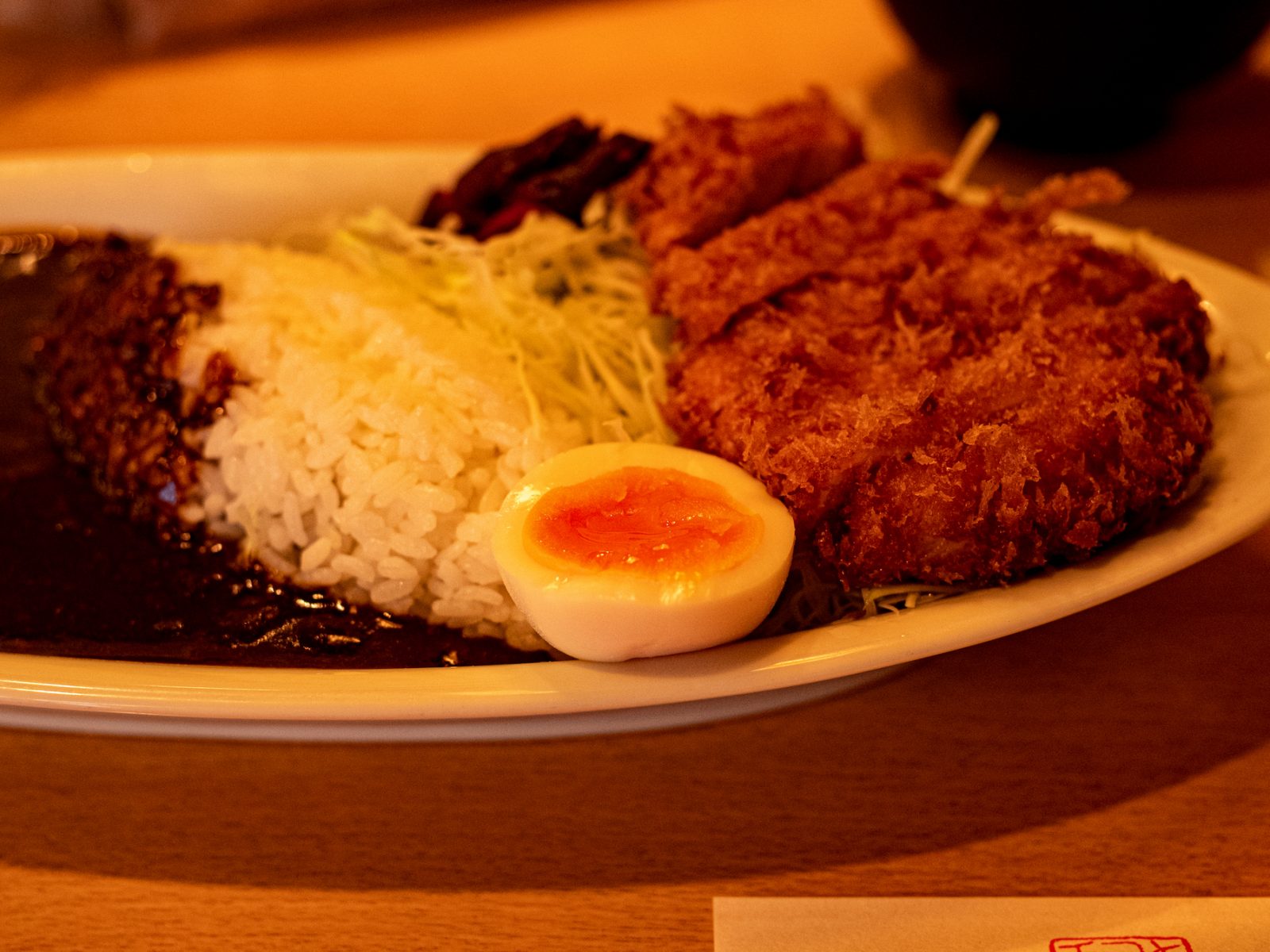 オーバルのお皿に盛られた「カツと特製カレー」が目の前にやってきました。なんと、半熟玉子の美しいこと。大きめの柴漬けがたっぷり。カツだけをサクサクで楽しむこともできるよう、そしてカレーが混ざらぬように。カツはごはんの土手と千切りキャベツのベッドに守られている。