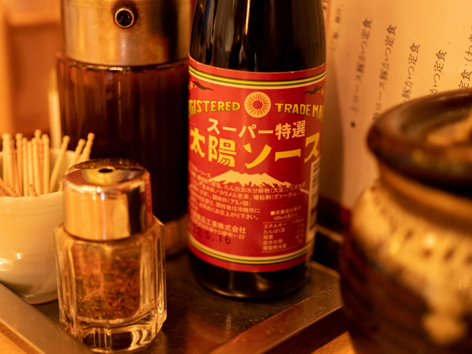 「太陽ソース」と書かれたウスターソースも、とても気になります。愛知県清須市でつくられているソース。あとで調べてみると1928年から続く老舗、ソースとケチャップを製造する「太陽食品工業株式会社」という会社で作られているソースでした。2番目のカツの真ん中に、さらりと太陽ソースを垂らすとスパイスの香りが瞬時にしてきます。甘みの強いとろっとしたソースとはまた違い、ウスターソースをかけると豚肉の甘味より肉の香りが先にくる。これまた、口の中がたのしい。