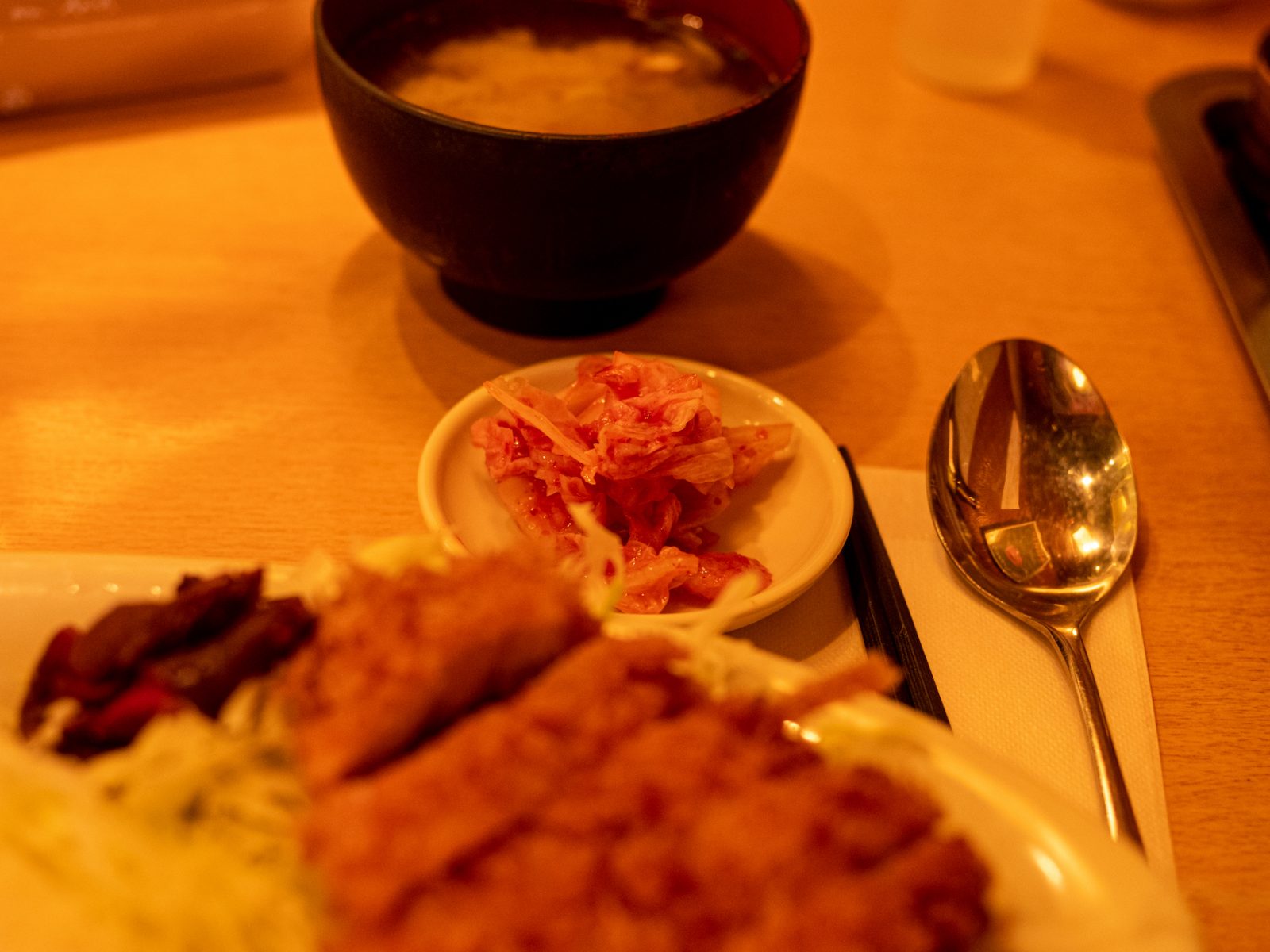 ちょっといったんクールダウン。ここ、ポンチ軒さんにはキムチの壺が置かれているのです。小皿にとったキムチで箸休め。優しい味。口の中がすっきりします。