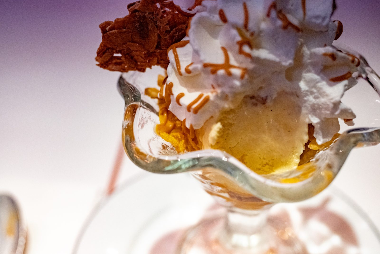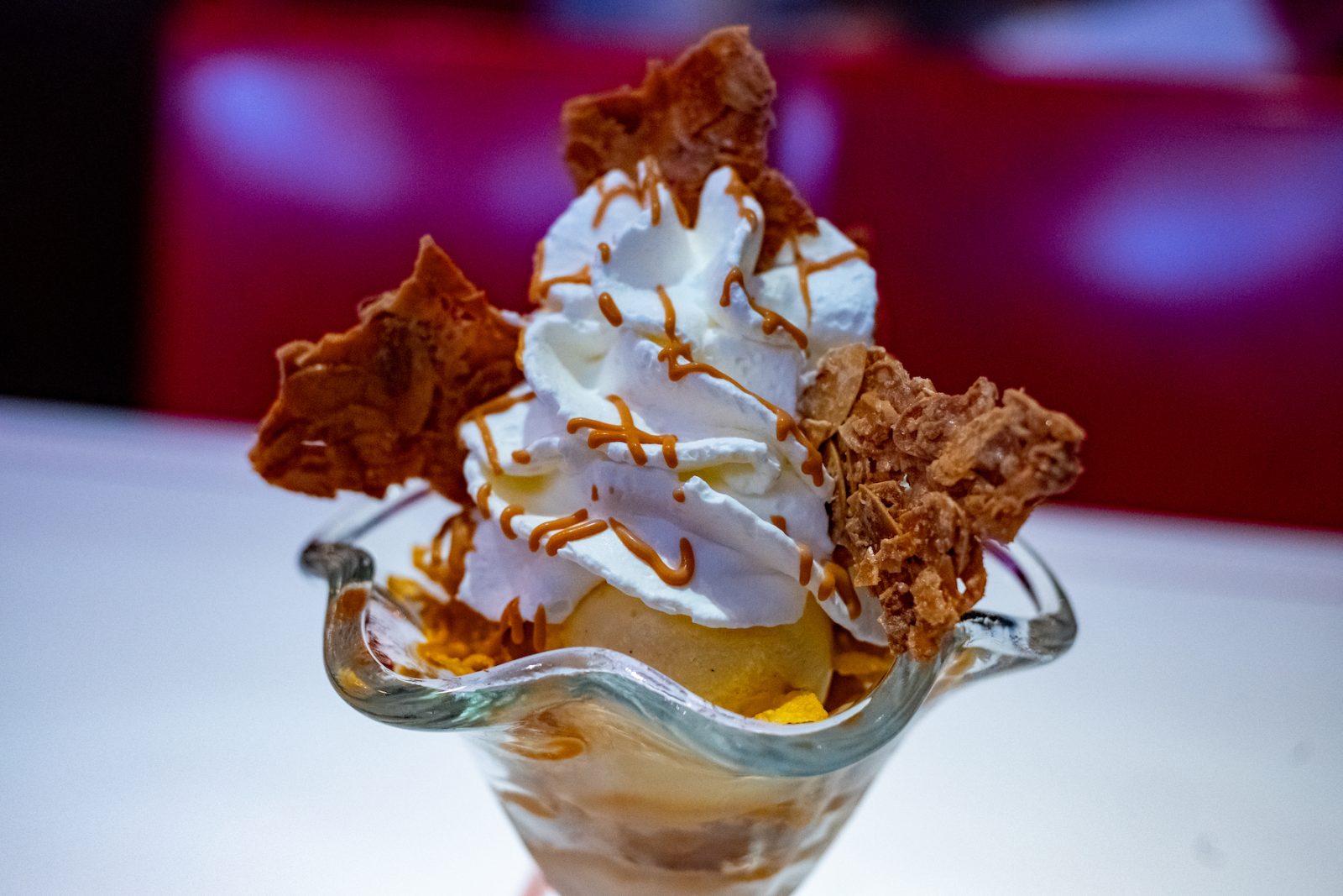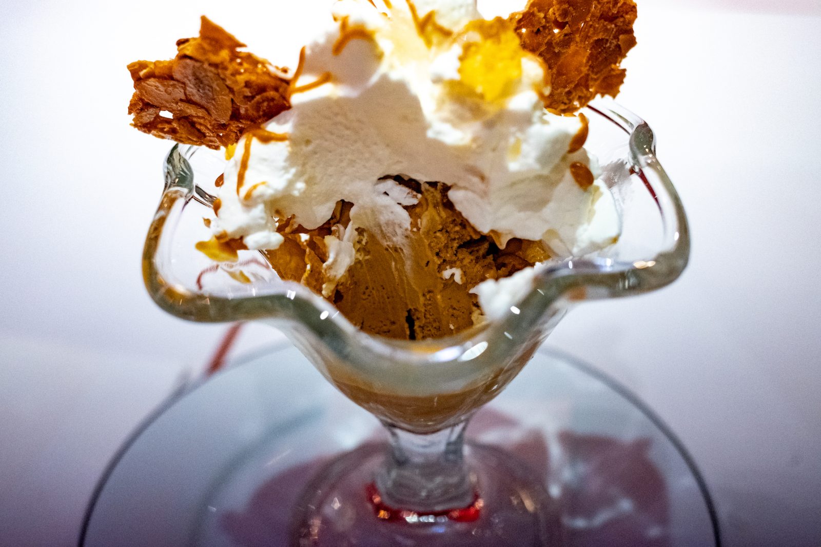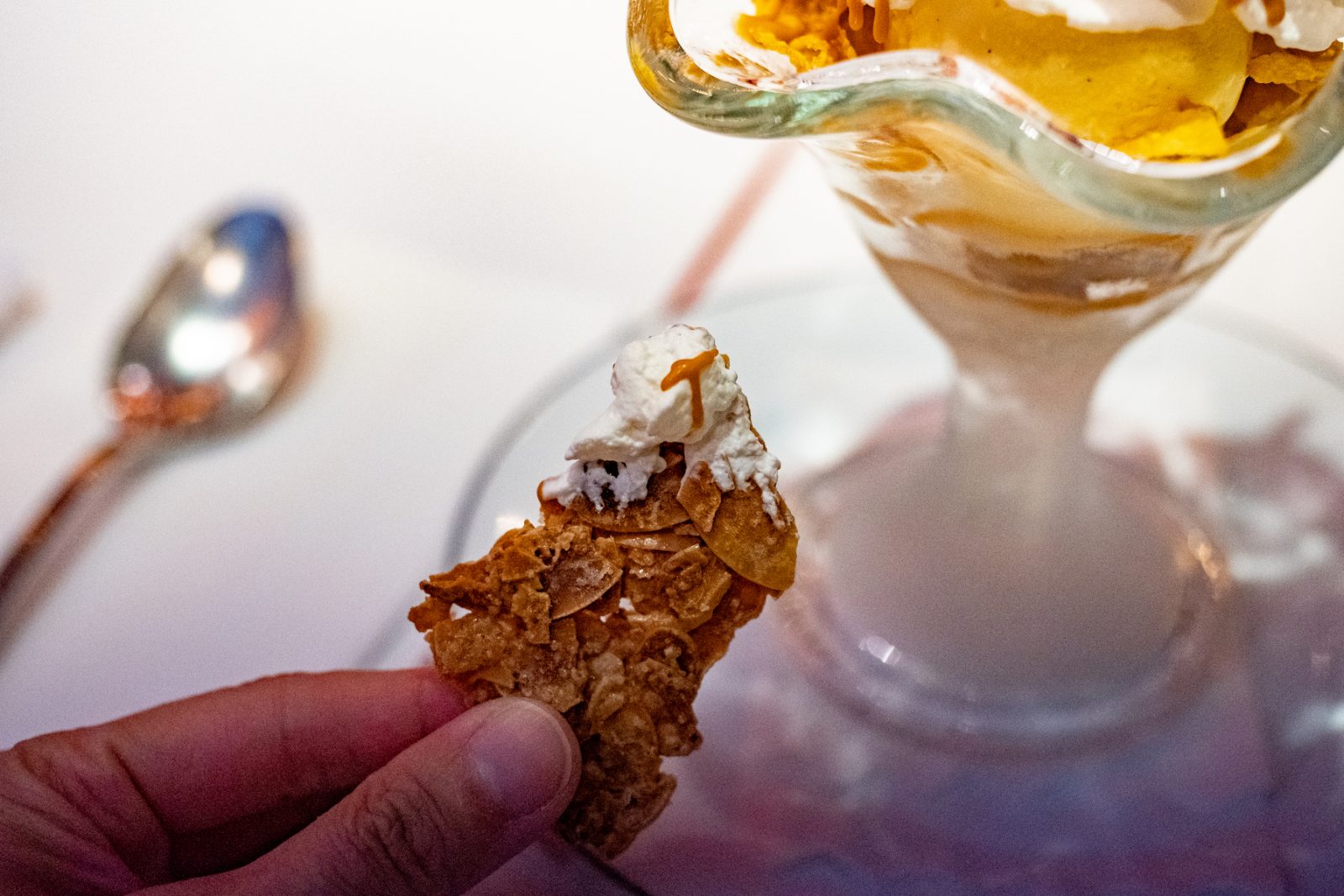 生クリームの山が倒れないようにバニラアイスを食べ終えると、今度はキャラメルのアイスクリームが待ち構えています。ほろっと苦いアイスクリーム。生クリーム2:アイス1:コーンフレーク0.2。コーンフレークが愛しすぎて、キャラメルのアイスを食べる頃には、その割合を減らさなければいけなくなった。