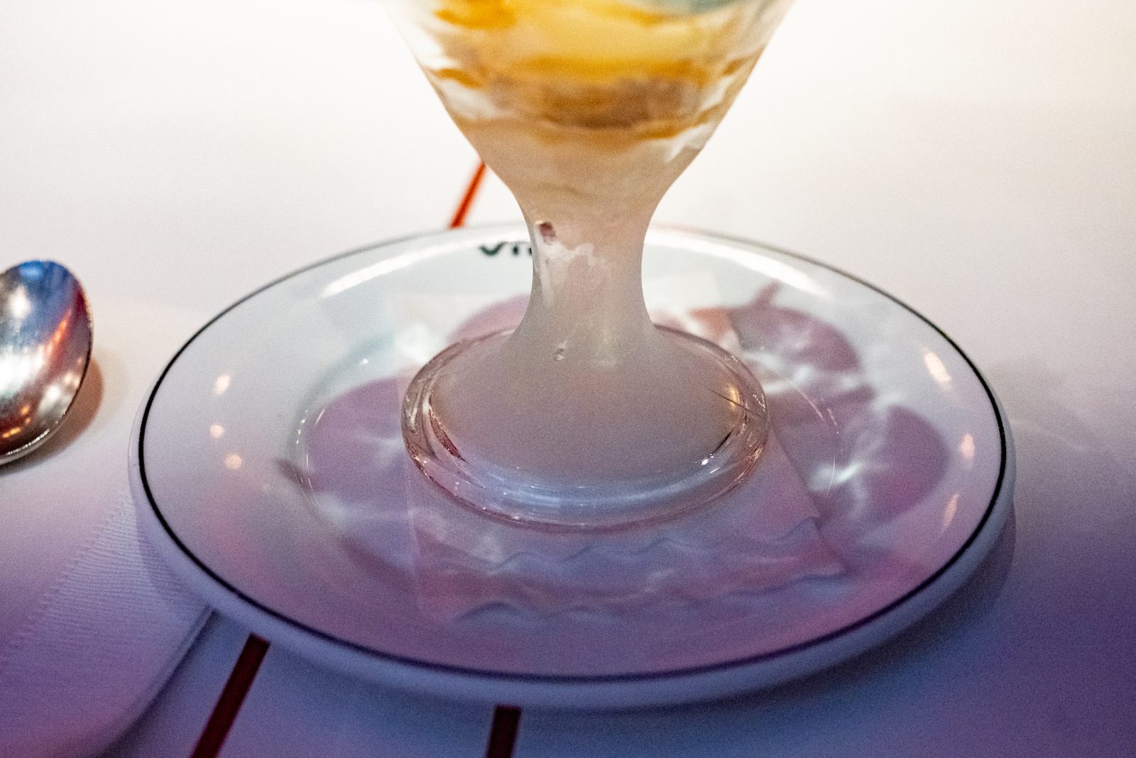 パフェの時間も終わりが近づいて受け皿に目を落とすと、お皿にも花が咲いていました。アイスが早く溶けないようにと、心配りがされたパフェグラス。まだ冷たく凍っています。