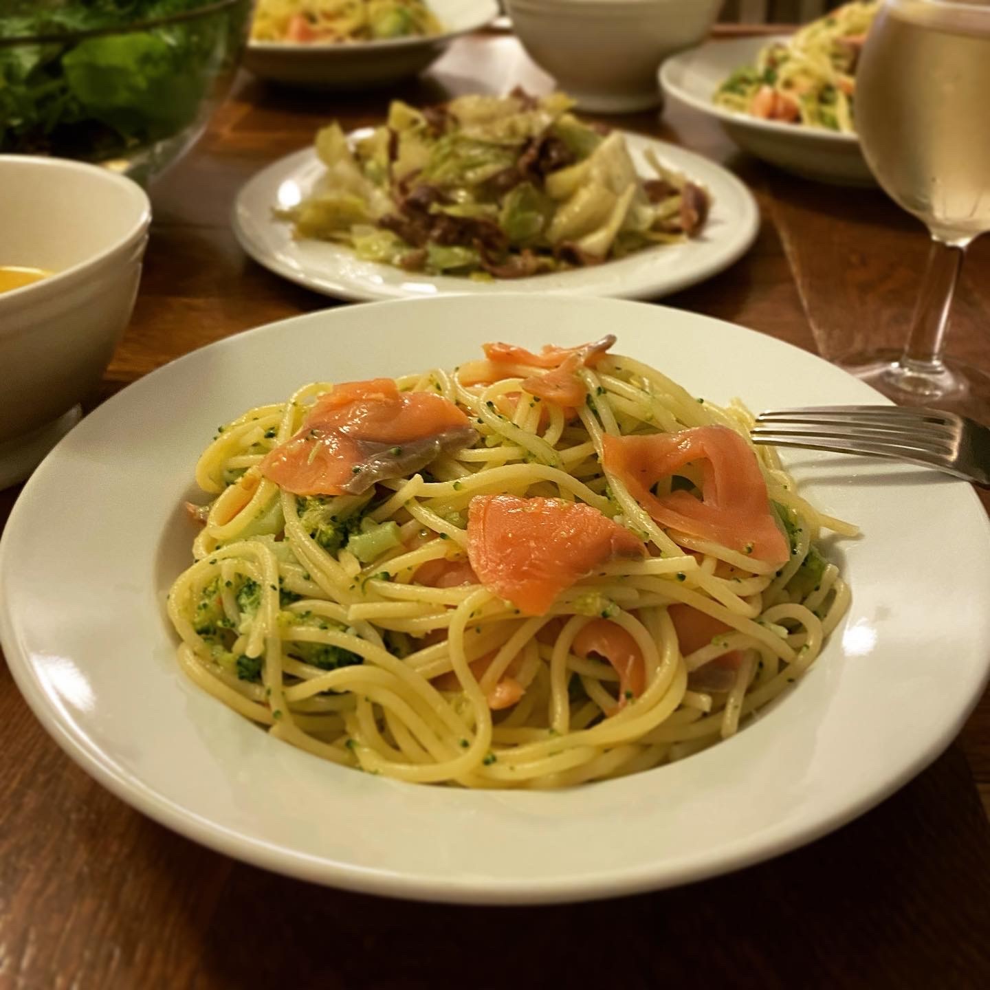 サーモンとブロッコリーのスパゲッティー、キャベツと砂肝のカレー炒め、葉っぱのサラダ、かぼちゃのポタージュ