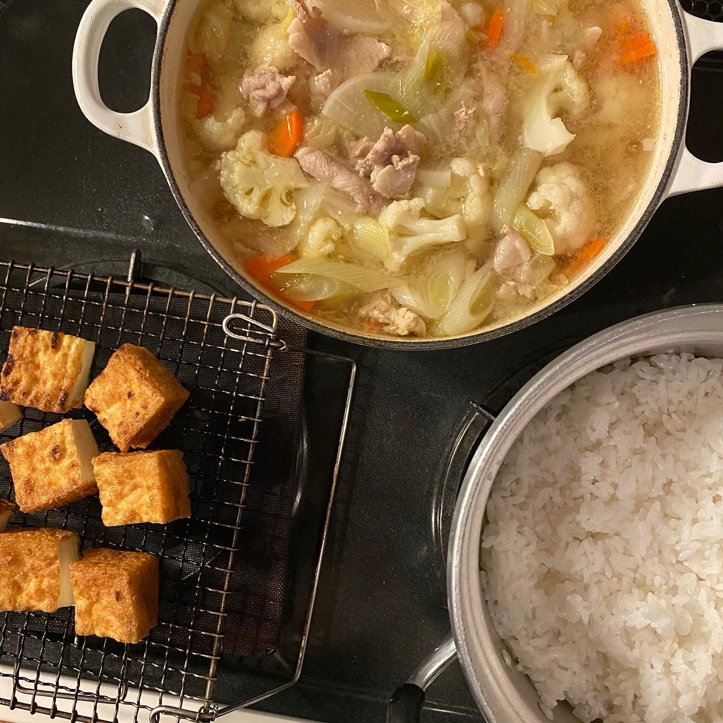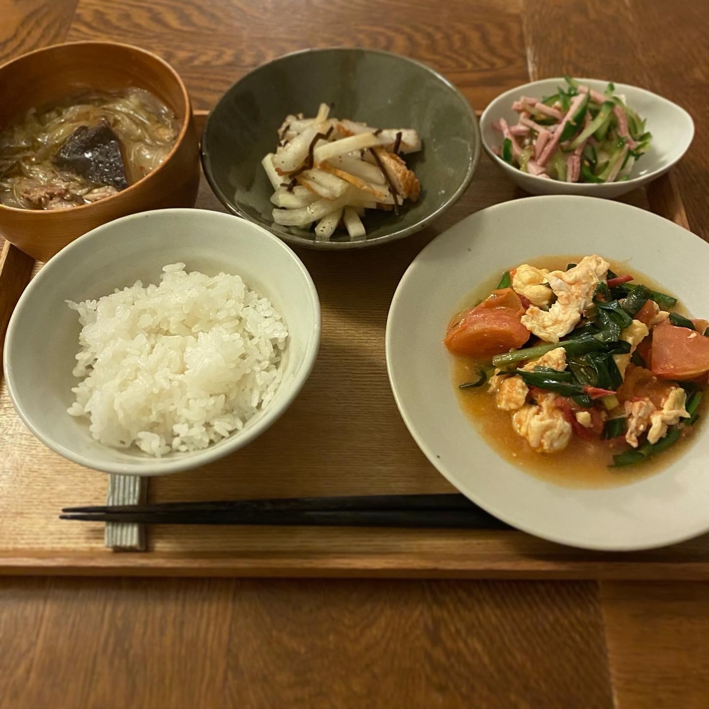 トマトと卵とニラの炒め物、大根とさつま揚げと塩昆布の和え物、冷奴(ハム、胡瓜)、ピェンローの残りスープ、白ごはん
