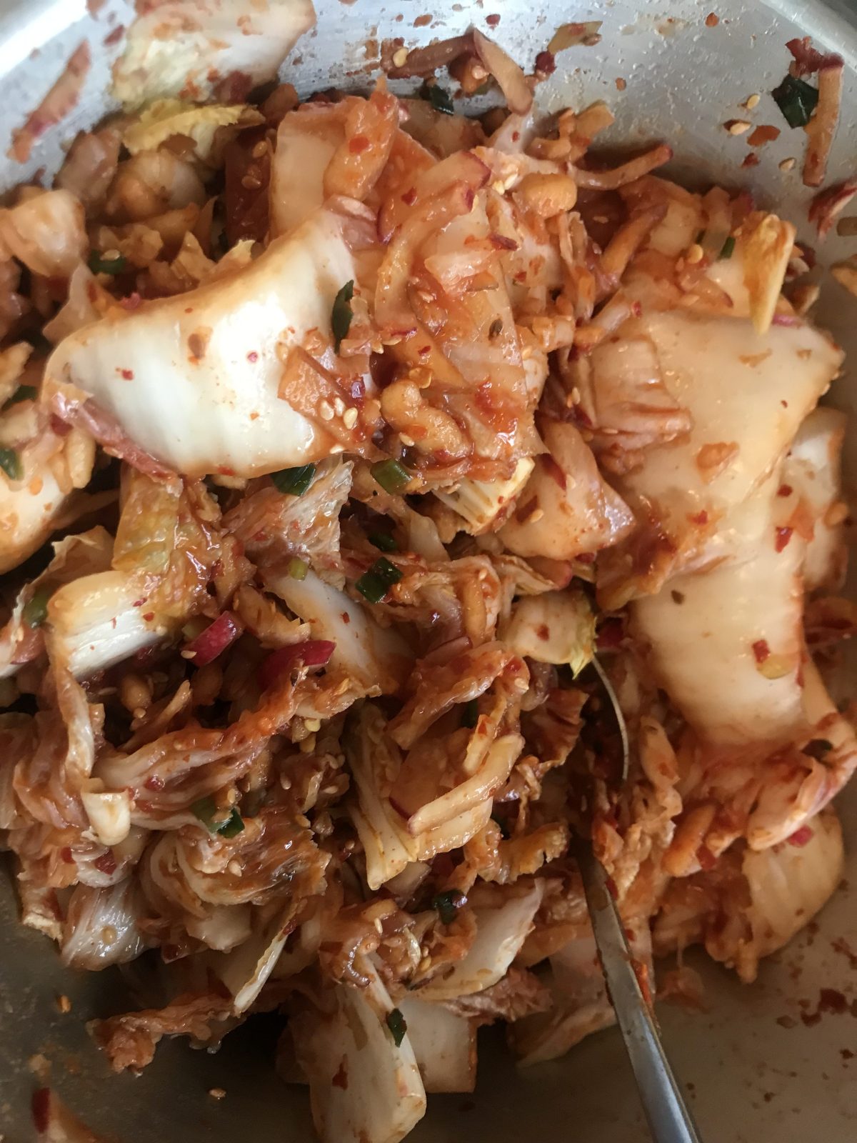 試しにせっかく漬け込んだキムチを洗ってみるも、一旦着いた辛味はもう取れない。
