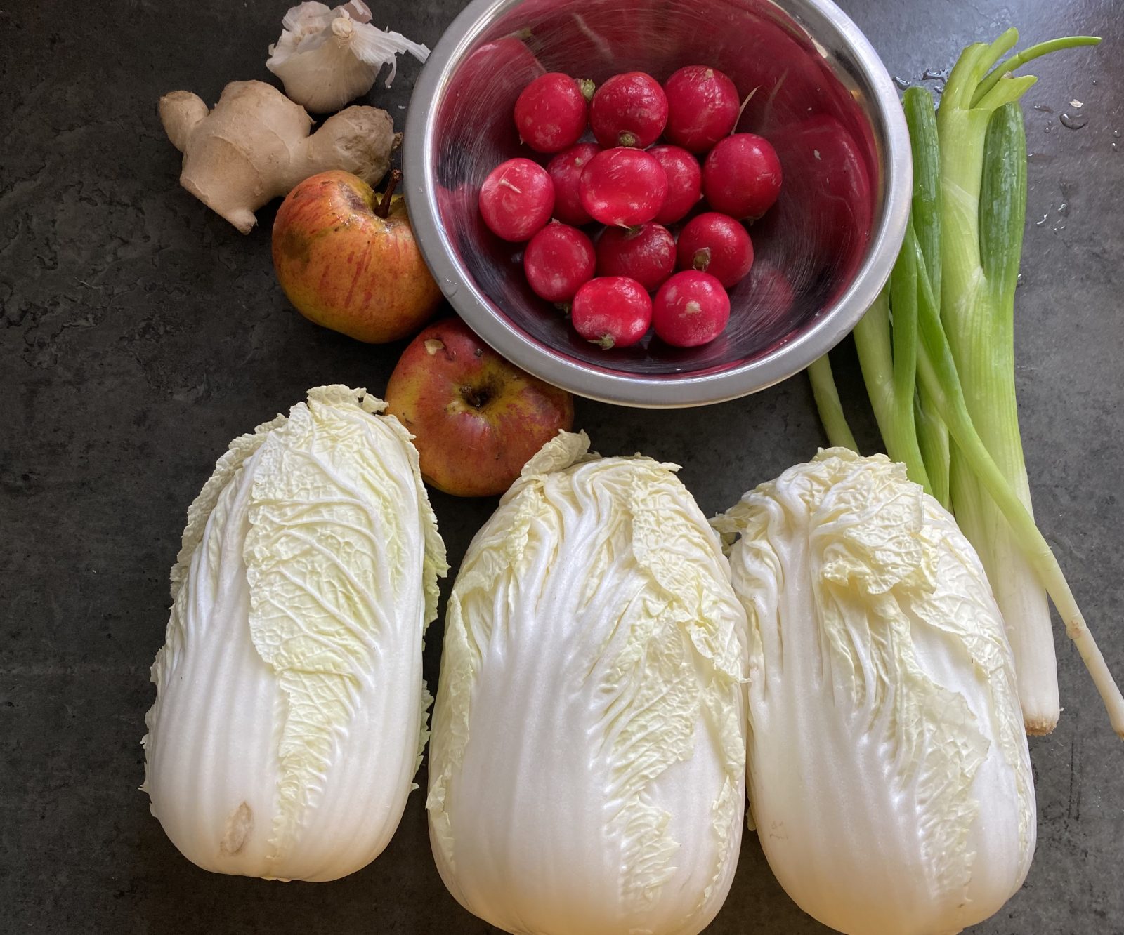 手持ちの料理本だと、なしや大根、あみなど、こちらでは手に入らない材料もありますが、なしはりんご、大根はラディッシュ、あみは乾燥エビをブレンダーにかけて粉末状にした物で代用してます。
