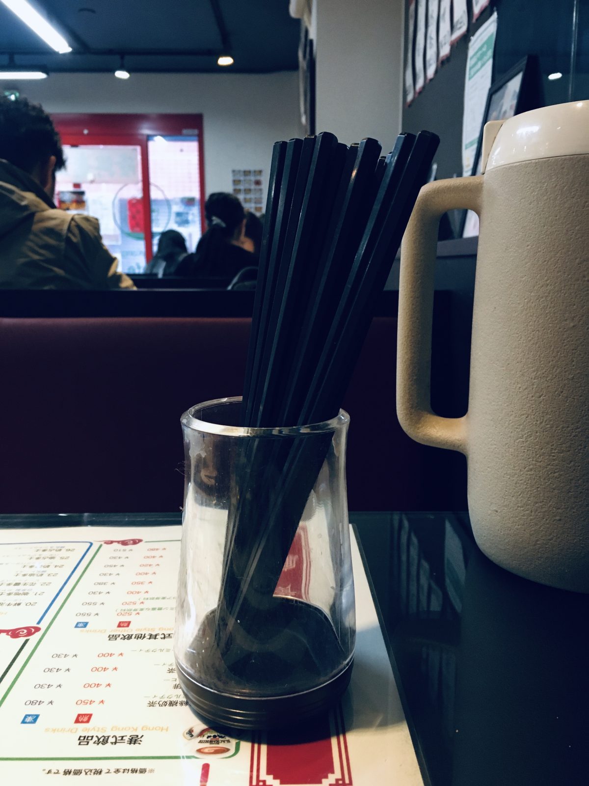 この妙に長いプラスチックの箸も香港ならでは。現地ではまず、お湯の入ったコップに