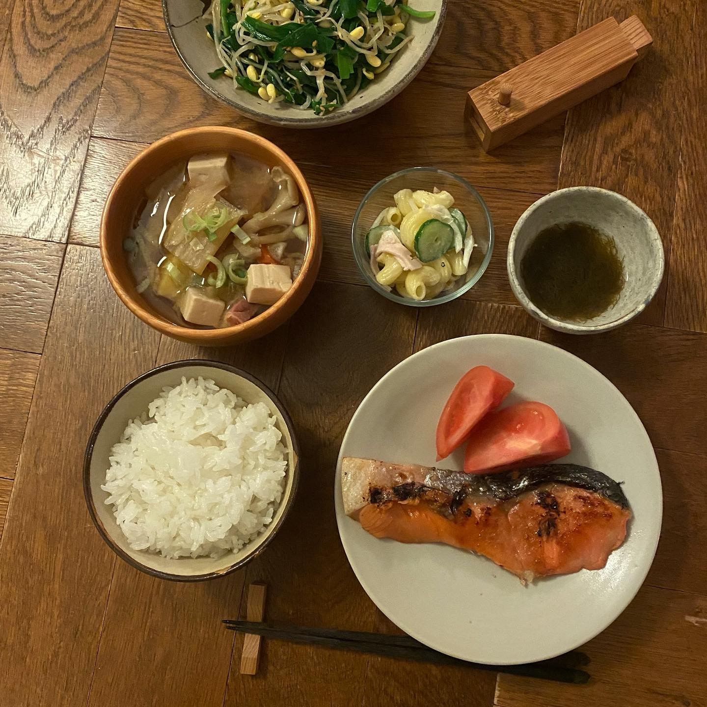 西京焼き(鮭、ひらす)、にらともやしのナムル、マカロニサラダ、もずく酢、トマト、ベーコン豚汁、白ごはん