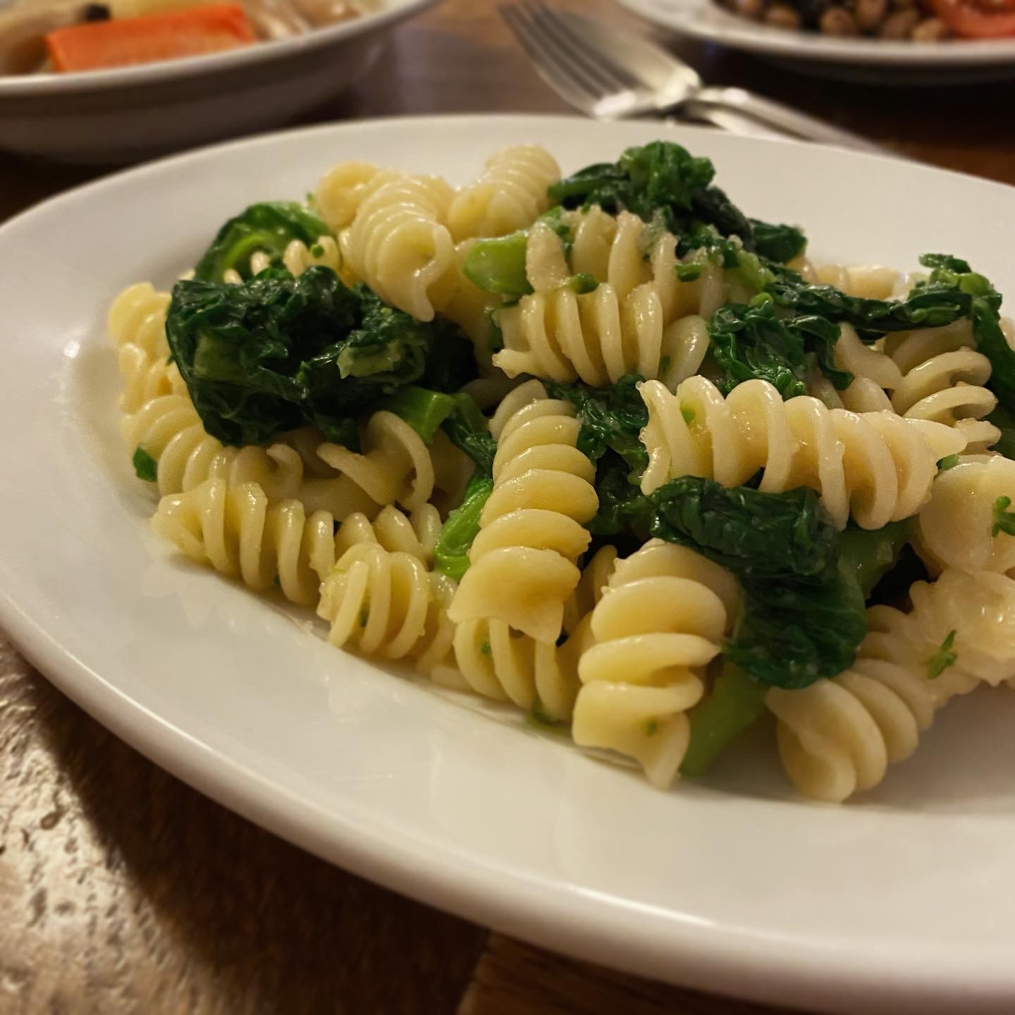 たらこと菜花のパスタ、トマトとサニーレタスのサラダ、ポトフののこり