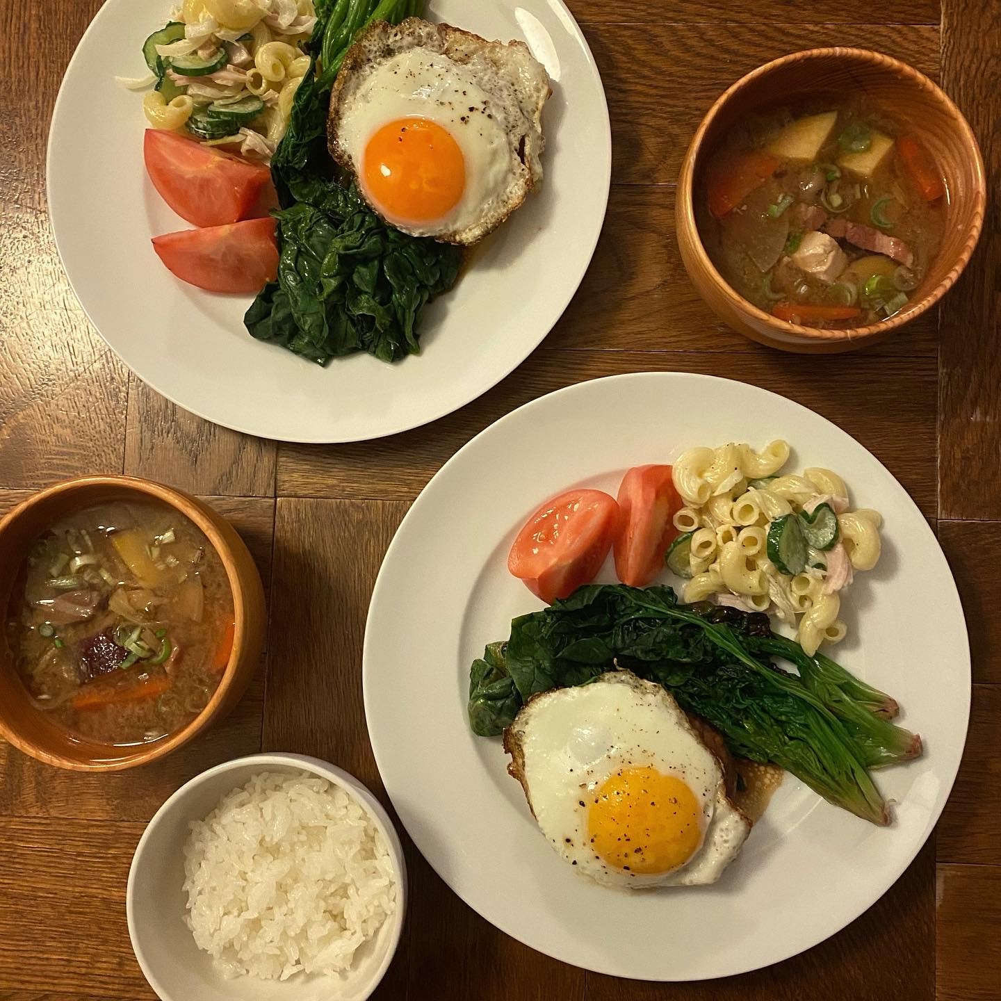 目玉焼きハンバーグ、ちぢみほうれん草のソテー、トマト、マカロニサラダ、豚汁、白ご飯