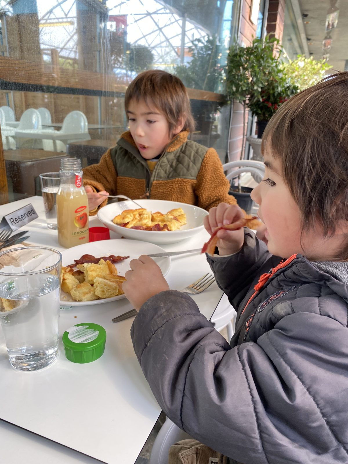 私のミニキッシュのお皿を息子2号用にしてパンケーキとベーコンを二人で分けさせる。