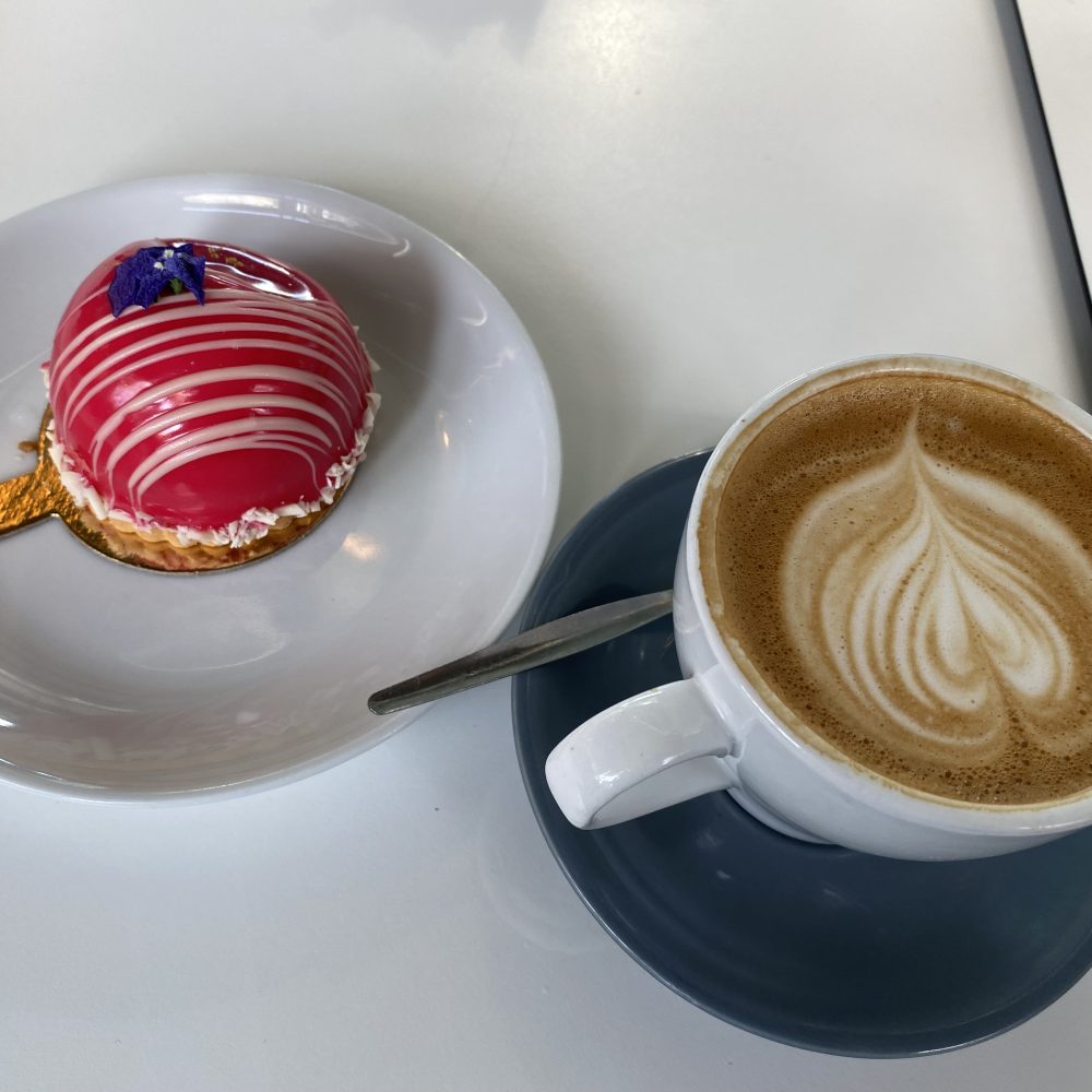 最近ランチはガッツリ食べず、軽くフルーツやクラッカーとチーズをつまむ私。頼んだのはカフェラテにミニキッシュとケーキ。
