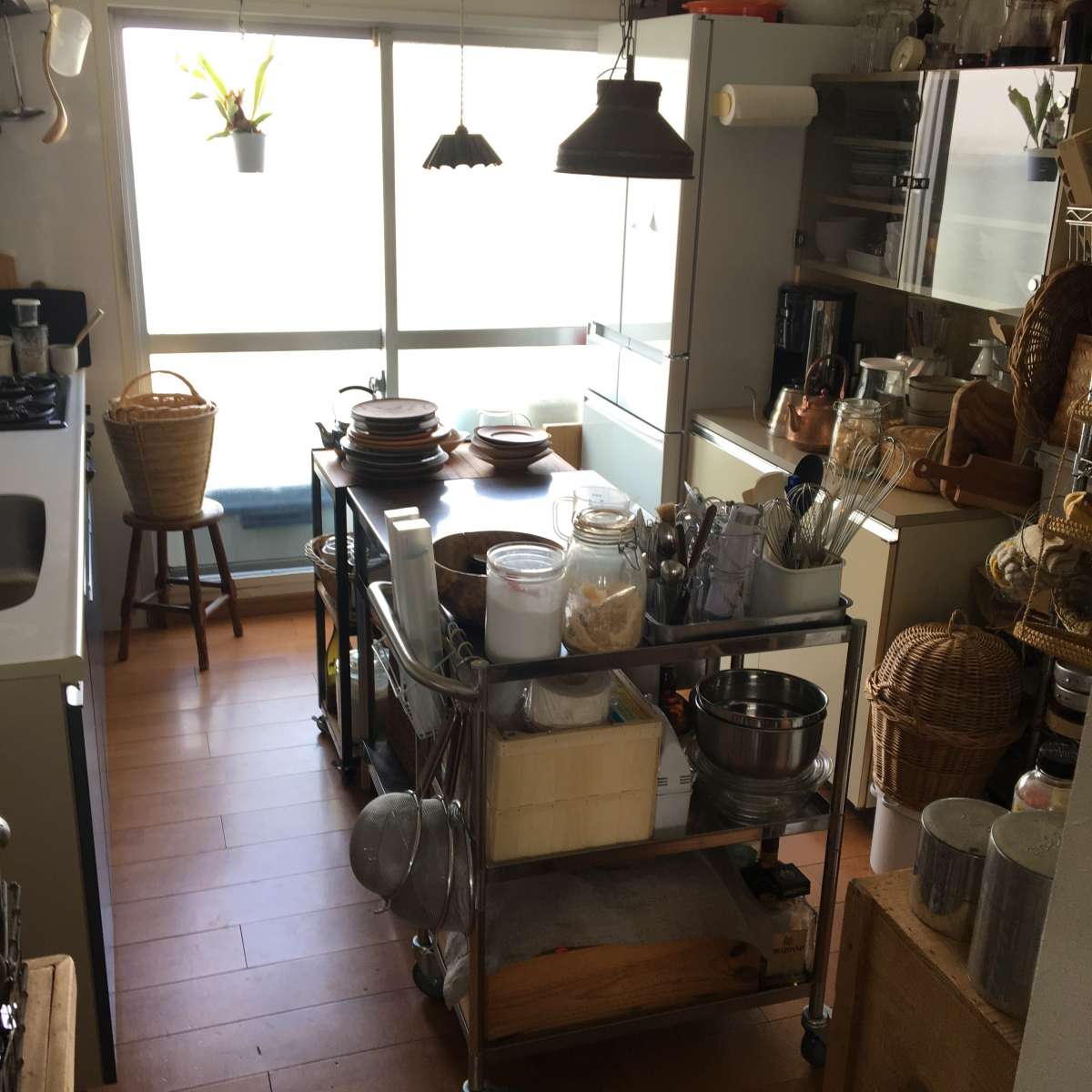 自分で塗り替えた戸棚、夫が学生時代から使っていたスチール棚、シルバーセンターからやってきた昭和な食器棚、中古の作業台とワゴン2台をくっつけた手作りアイランド風キッチン…