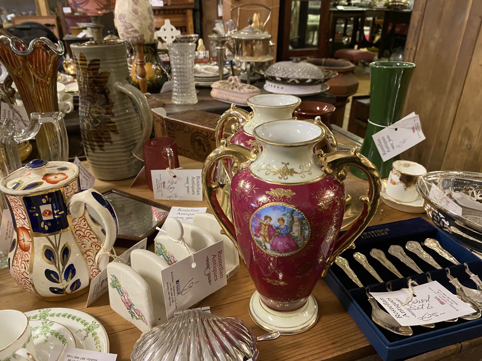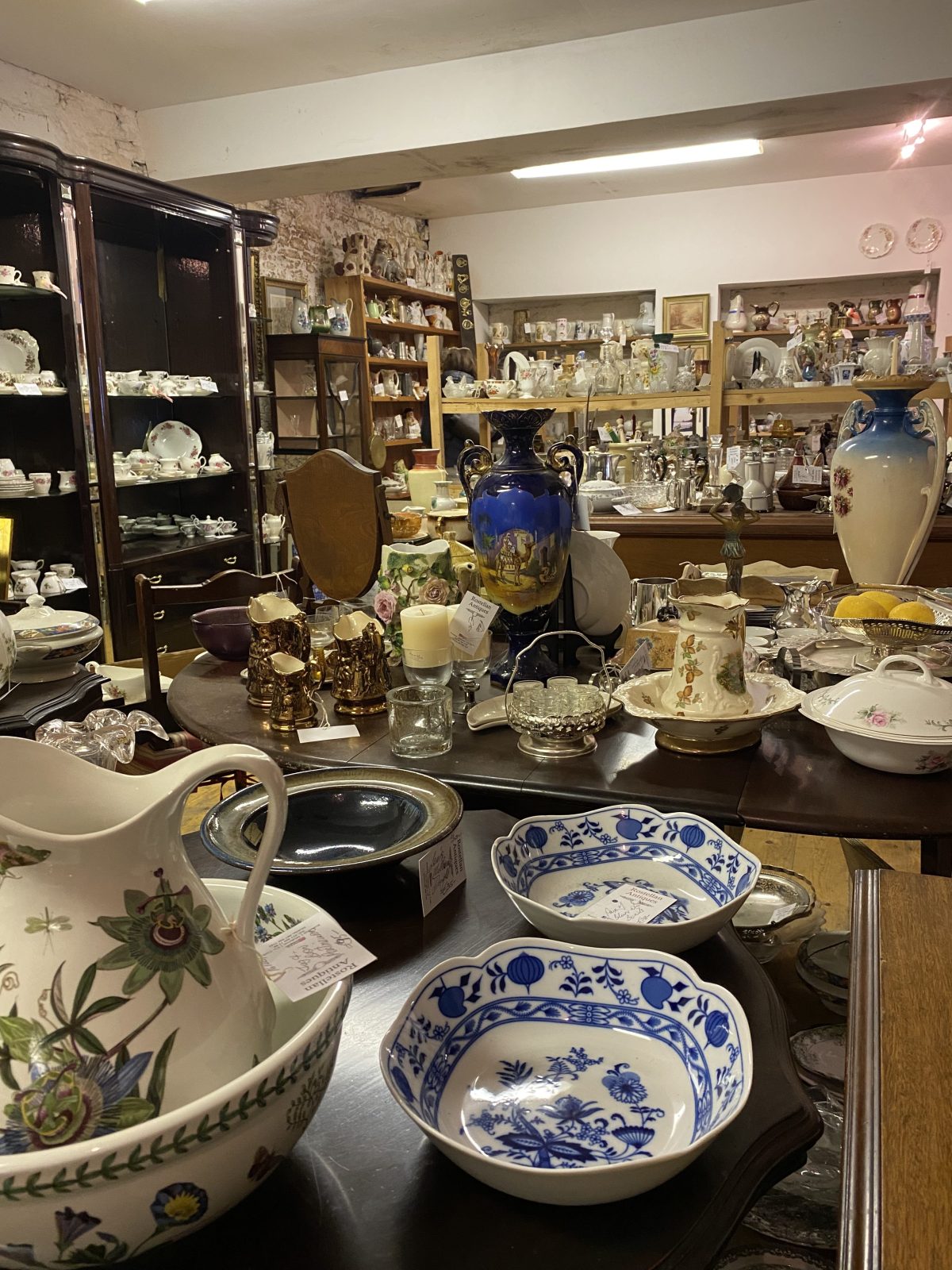 中に入ると割と広い店内に食器や古い家具、インテリア装飾がずらりと並ぶ。