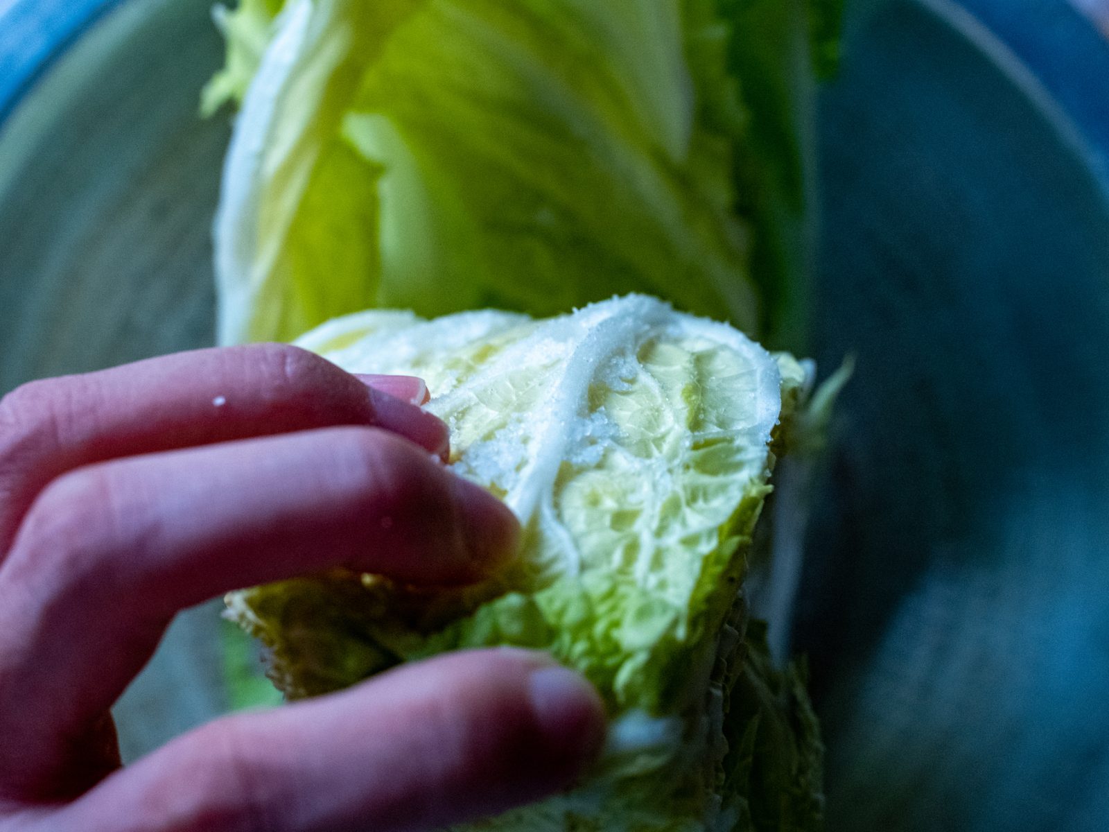 「塩をうまくふれたら、半分は成功したようなものです」4%の塩を白菜にあてる。水分がいいスピードで抜けて、ヤンニョムの旨味を染み込ませる前の大事な工程。