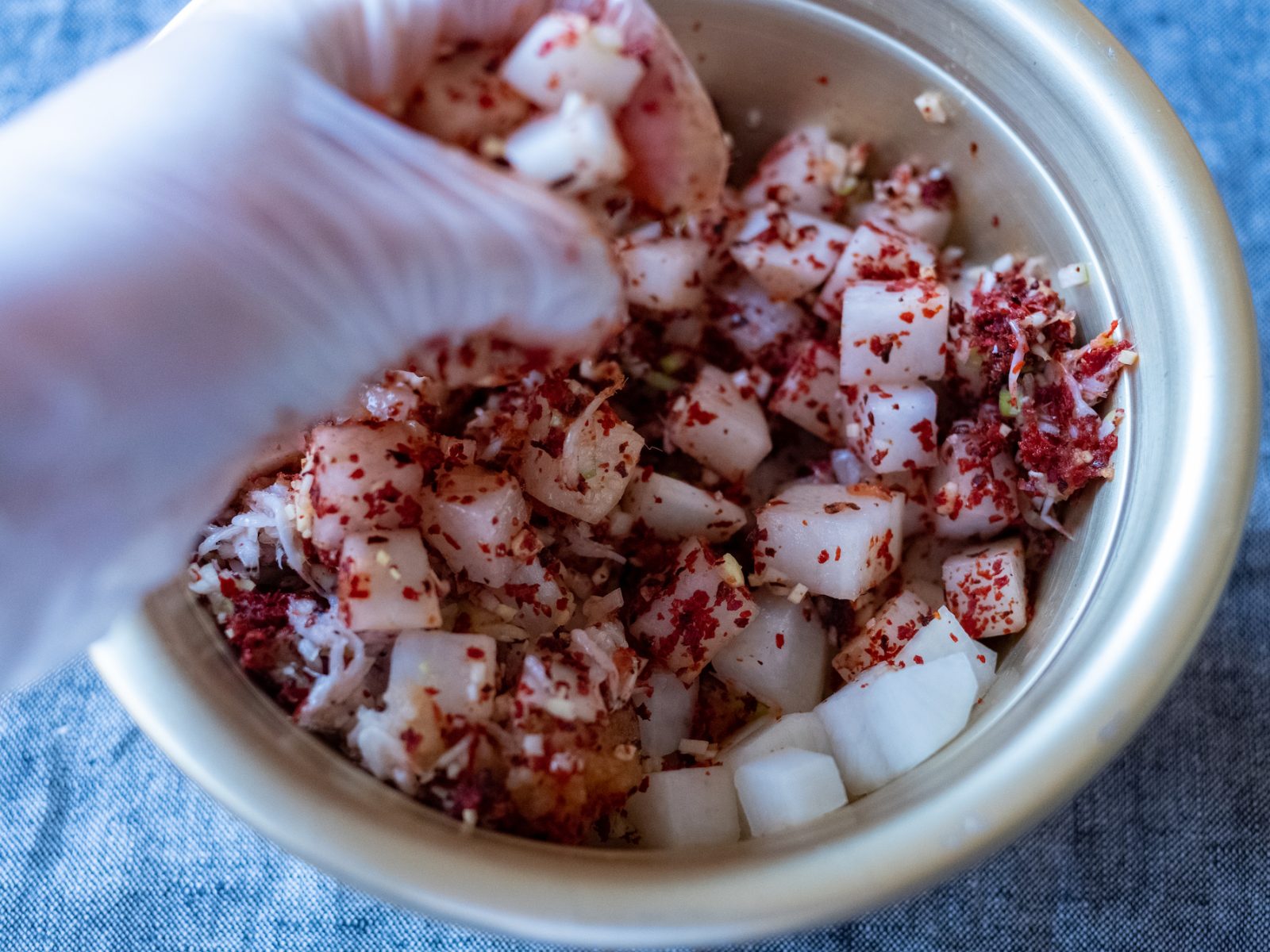 ちょいと話がそれましたが、キムチに挟み込んでいくヤンニョムを大きさを揃えて切っていきます。大根、せり、にら、白ねぎ。今の季節、梨がないので今回は王林を使ってみました。梨よりも水分量が少なく、甘味は強そうだから、発酵時どんな風に作用するのか少しドキドキしつつ。大根には塩をして置いておく。魚介類。今回は身が大きくて美味しそうな宮城の牡蠣が売っていたので牡蠣を選択。