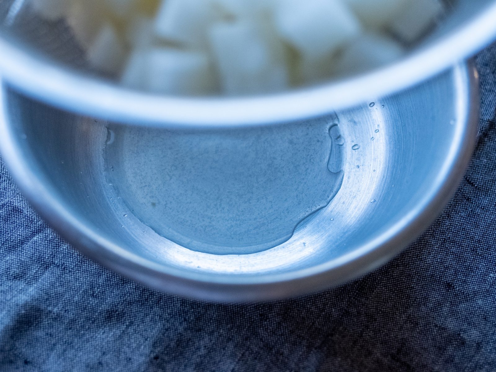 白菜を洗い、1/4にカットした白菜の葉をめくって、裏側に塩をすりこんでいく。ビニールの手袋をした先の塩と葉のざらざらとした肌触り。すりこみながらただよう、緊張感と不安感。白菜の水分を引き出して、いったん細胞の膜を壊し、後から挟み込むヤンニョムの味を染み込ませるための大事な役割を果たしてくれる塩。発酵を通り越して腐敗をしてしまわないようにするのも塩の役目。「こつの科学」という書籍で調べてみると、他にも、塩に強い乳酸菌を適度な速度で発育させる役割も塩にはあるそうです。(『新装版「こつの科学」調理の疑問に答える。』杉田浩一著 柴田書店刊:参照)
