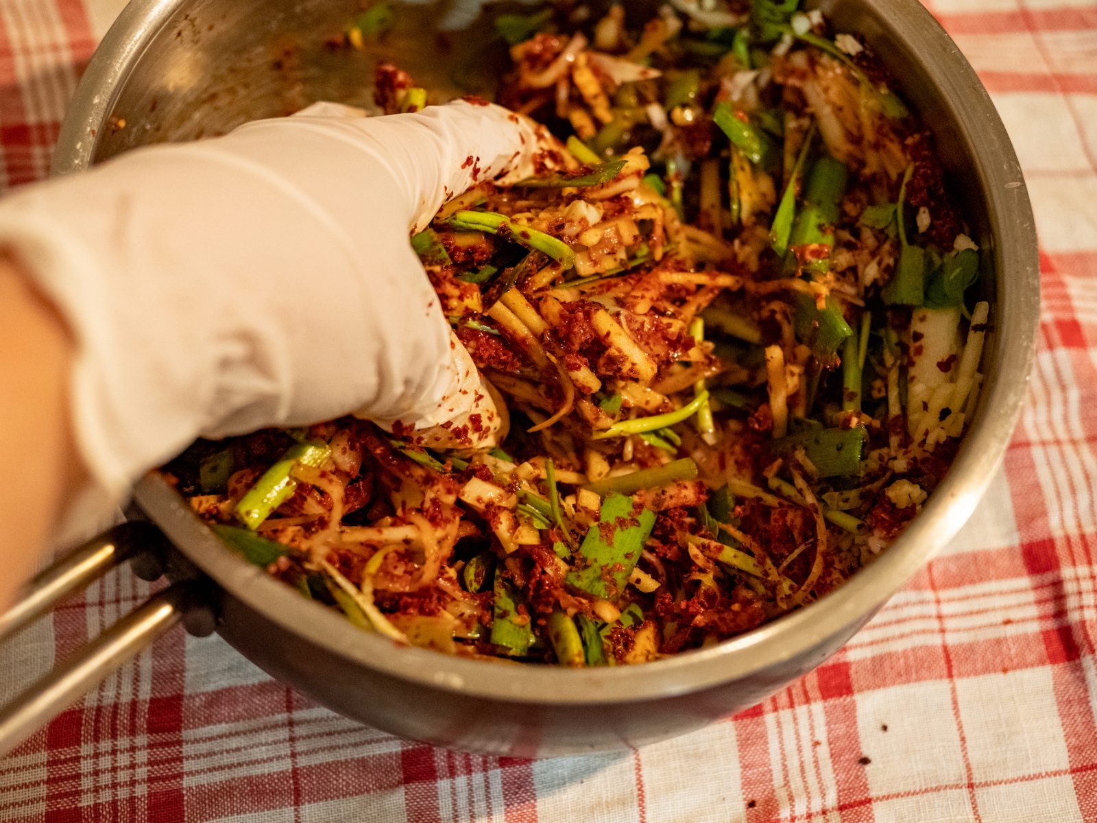 白菜の間に挟むヤンニョムの分量はこのくらいずつでいいのか。迷いながら葉の間にはさんでいく。よくありがちな、最初に遠慮して少なく挟んで、最後に大量に具材が余るのとは逆のパターンで。ドキドキしつつも、初キムチに興奮していたわたしの5本の指は当初から多めの分量を掴んでいたようで。最後に塗り込むヤンニョムが少し足りなくなるという事態に。