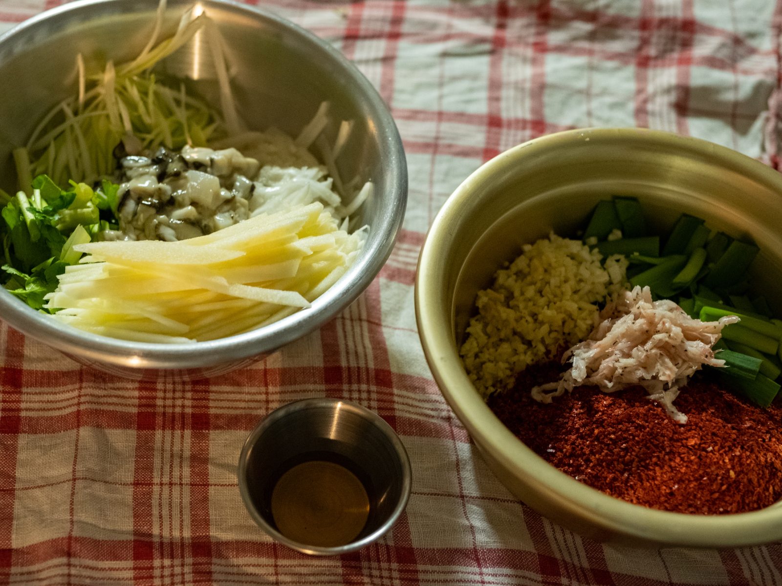 キムチはパンと同じく発酵の力を借りなければ、おいしくならない。アミの塩辛である새우젓(セウジョッ)と海産物。乳酸菌においしくしてくださいと祈りつつ。親戚が集まって大量のキムチを漬ける様子を、ドラマで何度となく見ていましたが、自分一人で漬けるとなるとその分量はどのくらいから始めるのがいいのか。