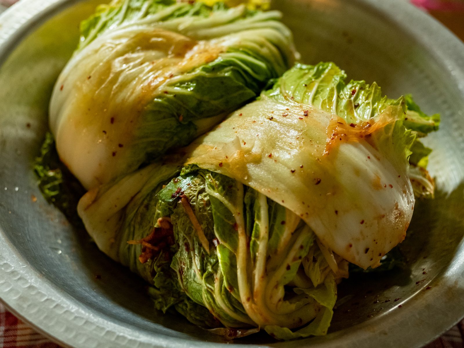 まず目から入ってくる情報をチェック。ヤンニョムに入っているくたっとしたニラとせり。次に手の感触からチェック。持ち上げた時の白菜の柔らかさは、おいしく漬かっているのではないかという期待を持たせてくれる。